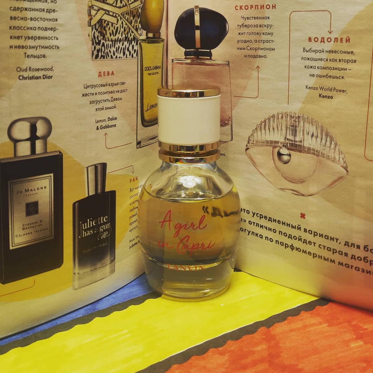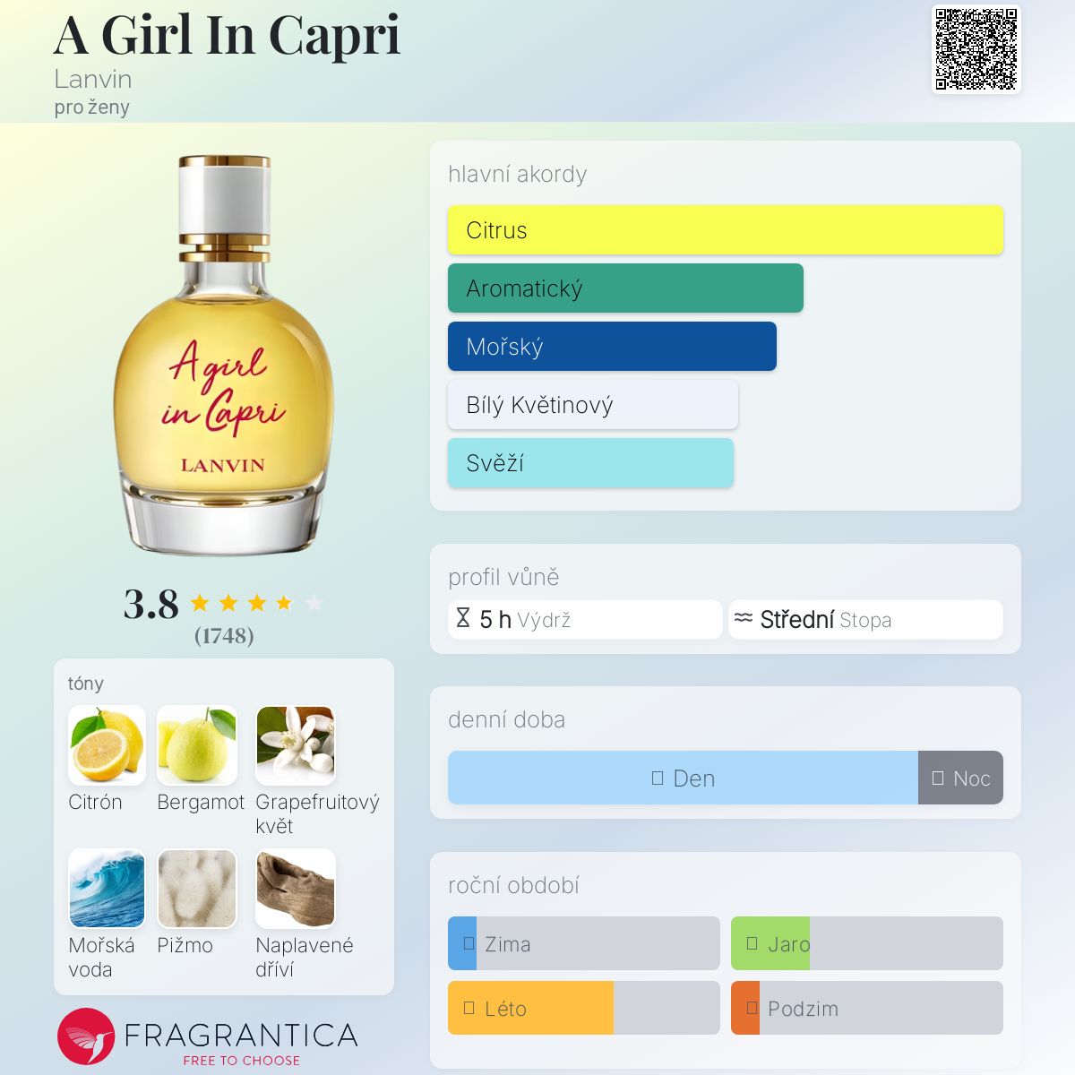 A Girl In Capri podle Lanvin je Citrus vůně pro ženy. A Girl In Capri byl/a uveden/a v roce 2019. "Nosem" za touto vůní je Sophie Labbe. Vrchní tóny jsou Italský citrón a Bergamot; střední tóny jsouGrapefruitový květ a Mořské tóny ; základní tóny jsou Bílé pižmo, Naplavené dříví a Jantar (ambra).