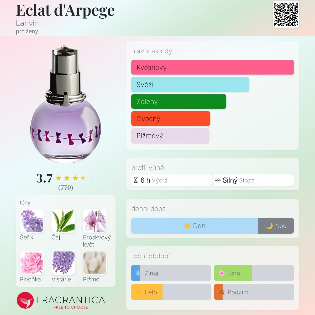 Eclat d'Arpege podle Lanvin je Floral Green vůně pro ženy. Eclat d'Arpege byl/a uveden/a v roce 2010. Vrchní tóny jsou Zelený šeřík a Petitgrain; střední tóny jsouZelený čaj, Broskvový květ, Červená pivoňka, Vistárie a Vonokvětka čínská ; základní tóny jsou Pižmo, Cedr a Jantar (ambra).