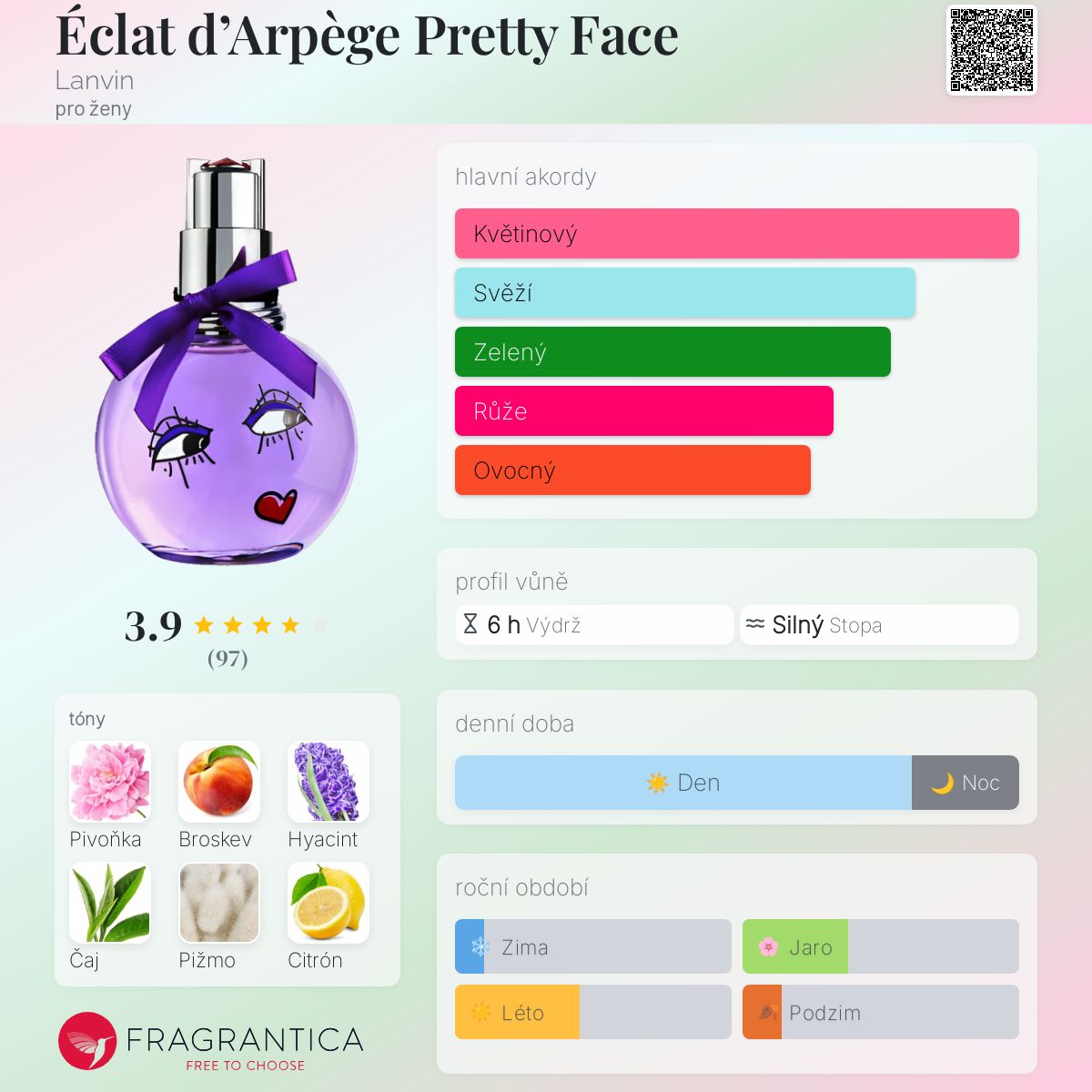 Éclat d’Arpège Pretty Face podle Lanvin je Floral Fruity vůně pro ženy. Éclat d’Arpège Pretty Face byl/a uveden/a v roce 2013. Vrchní tóny jsou Hyacint, Zelený čaj a Citrón; střední tóny jsouPivoňka a Broskev ; základní tóny jsou Bílé pižmo a Cedr.