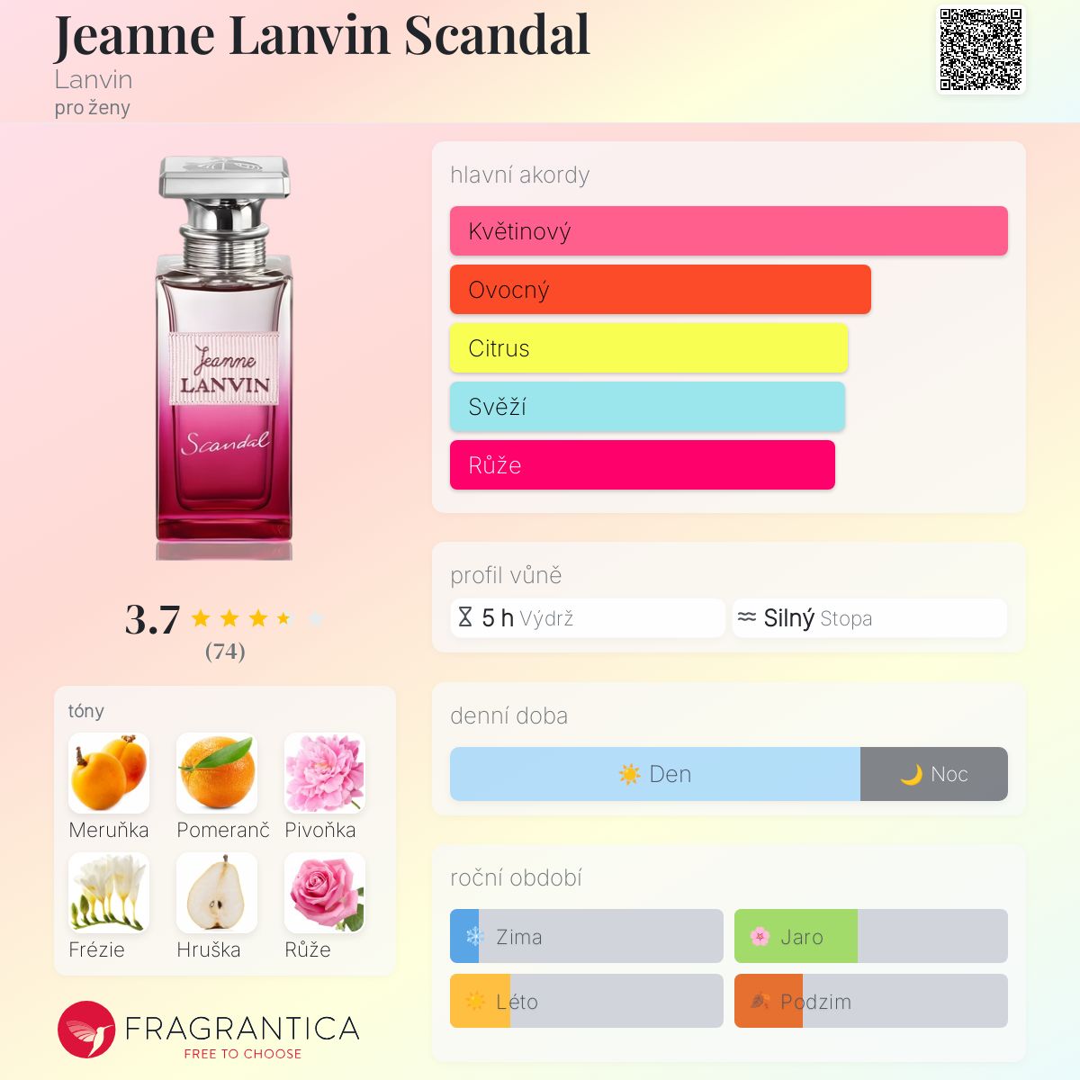 Jeanne Lanvin Scandal podle Lanvin je Floral Fruity vůně pro ženy. Jeanne Lanvin Scandal byl/a uveden/a v roce 2016. "Nosem" za touto vůní je Anne Flipo. Vrchní tóny jsou Meruňka, Pomeranč a Hruška; střední tóny jsouPivoňka, Frézie a Růže ; základní tóny jsou Pižmo a Santalové dřevo.