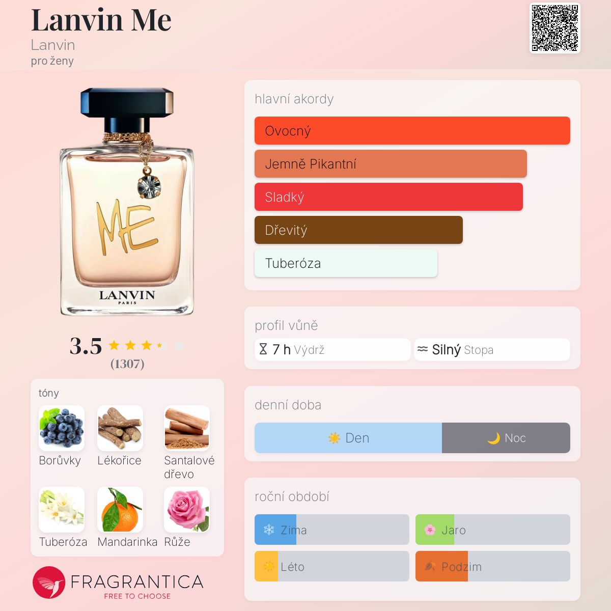 Lanvin Me podle Lanvin je Floral vůně pro ženy. Lanvin Me byl/a uveden/a v roce 2013. "Nosem" za touto vůní je Domitille Michalon Bertier. Vrchní tóny jsou Borůvky a Mandarinka; střední tóny jsouLékořice, Tuberóza a Růže ; základní tón je Santalové dřevo.