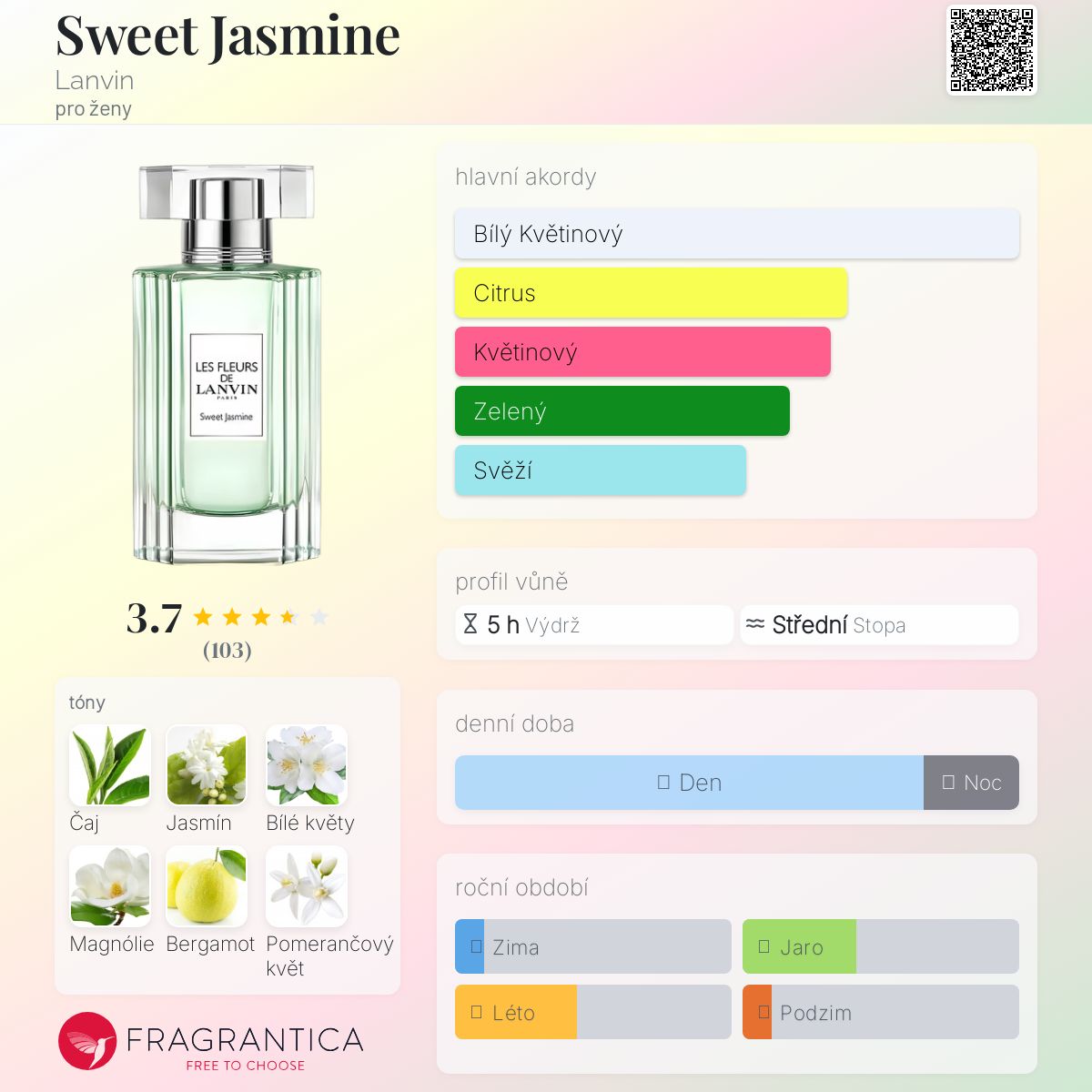 Sweet Jasmine podle Lanvin je Floral Green vůně pro ženy. Sweet Jasmine byl/a uveden/a v roce 2023. "Nosem" za touto vůní je Nicolas Beaulieu. Vrchní tóny jsou Zelený čaj a Bergamot; střední tóny jsouJasmín, Bílé květy, Magnólie a Pomerančový květ ; základní tón je Pižmo.