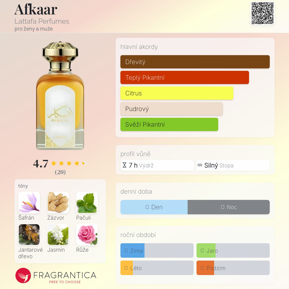 Afkaar podle Lattafa Perfumes je Orientální Spicy vůně pro ženy a muže. Afkaar byl/a uveden/a v roce 2023. Vrchní tóny jsou Šafrán, Zázvor, Bergamot a Mandarinka; střední tóny jsouList pačuli, Jantarové dřevo, Jasmín a Růže ; základní tóny jsou Santalové dřevo, Bílé pižmo, Vanilka a Dubový mech.