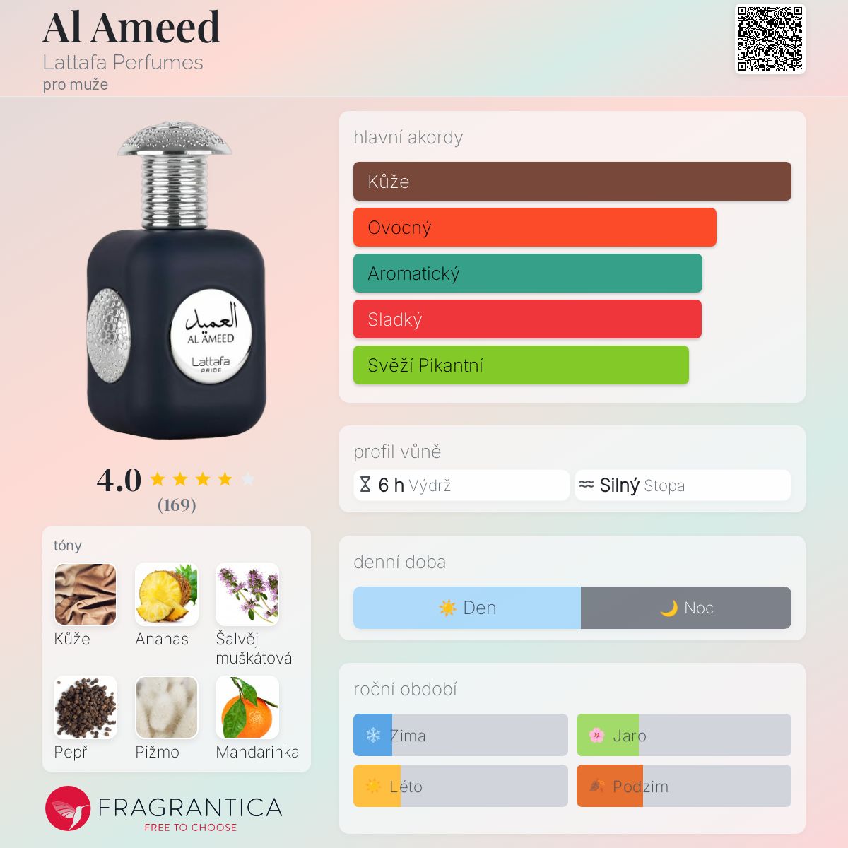Al Ameed podle Lattafa Perfumes je Aromatic Spicy vůně pro muže. Al Ameed byl/a uveden/a v roce 2022. Vrchní tóny jsou Šalvěj muškátová a Mandarinka; střední tóny jsouAnanas a Pepř ; základní tóny jsou Kůže a Pižmo.