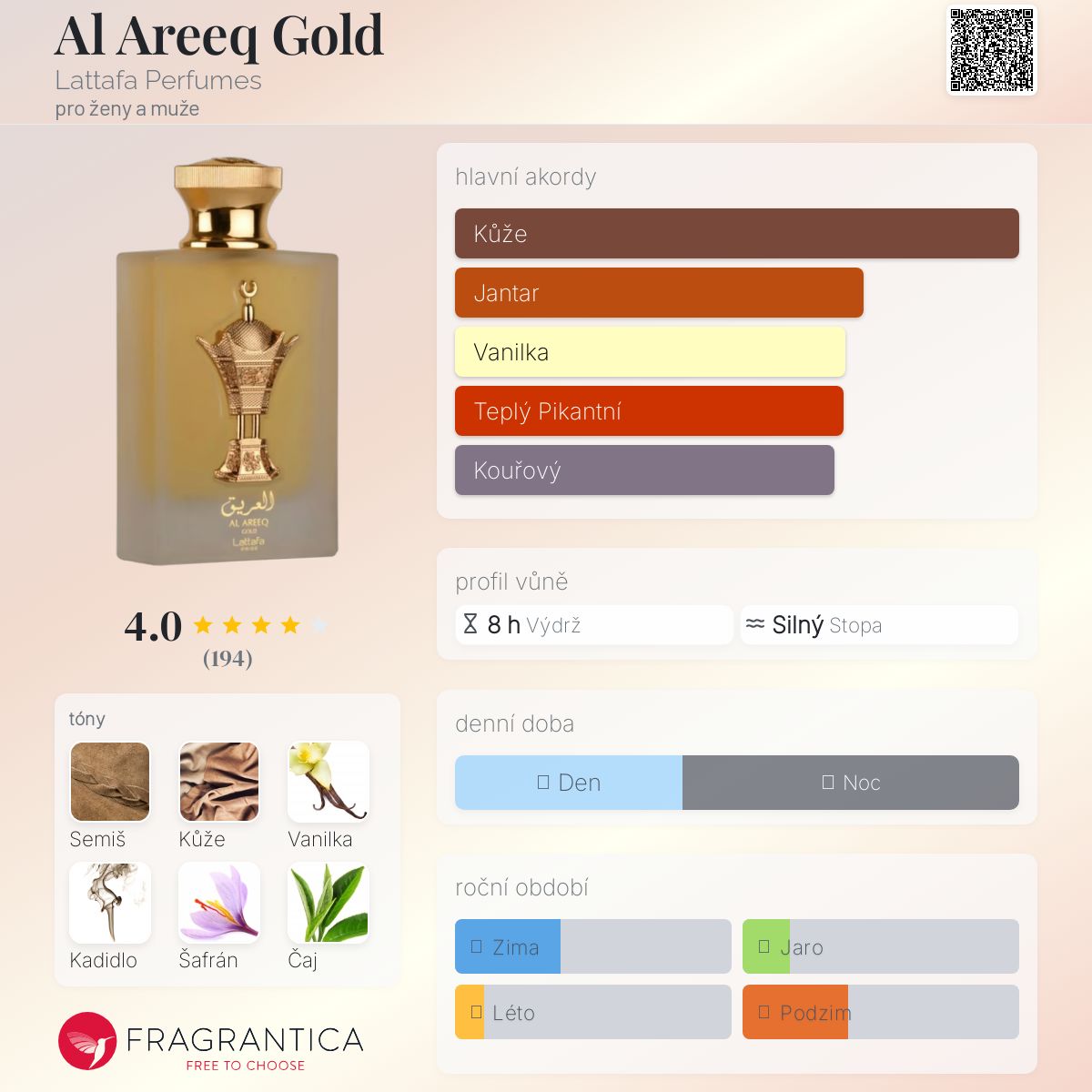 Al Areeq Gold podle Lattafa Perfumes je vůně pro ženy a muže. Al Areeq Gold byl/a uveden/a v roce 2022. Vrchní tóny jsou Šafrán a Černý čaj; střední tóny jsouSemiš, Kůže a Kadidlo ; základní tóny jsou Vanilka, Jantarové dřevo a Pižmo.