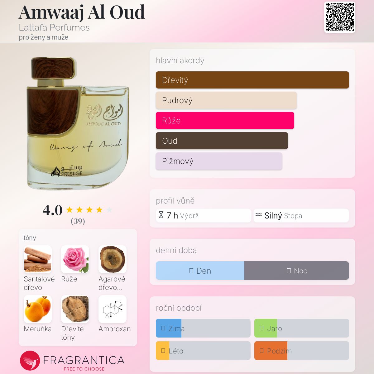 Amwaaj Al Oud podle Lattafa Perfumes je Orientální Woody vůně pro ženy a muže. Amwaaj Al Oud byl/a uveden/a v roce 2016. Vrchní tóny jsou Růže a Meruňka; střední tóny jsouDřevité tóny a Ambroxan ; základní tóny jsou Santalové dřevo, Agarové dřevo (oud) a Pižmo.