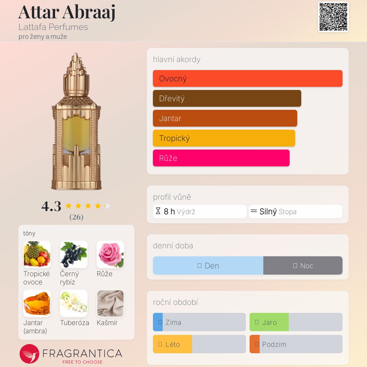 Attar Abraaj podle Lattafa Perfumes je Orientální Floral vůně pro ženy a muže. Toto je nová vůně. Attar Abraaj byl/a uveden/a v roce 2025. Vrchní tóny jsou Tropické ovoce, Černý rybíz a Kardamom; střední tóny jsouRůže, Jantar (ambra) a Tuberóza ; základní tóny jsou Kašmír, Santalové dřevo a Karamel.
