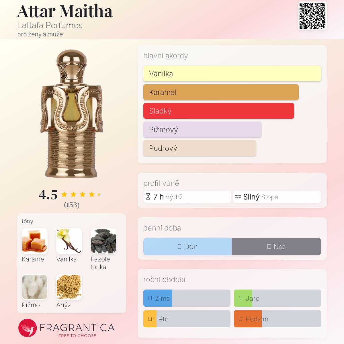 Attar Maitha podle Lattafa Perfumes je Orientální Vanilla vůně pro ženy a muže. Toto je nová vůně. Attar Maitha byl/a uveden/a v roce 2025. Vrchní tón je Anýz ; střední tón jeKaramel ; základní tóny jsou Vanilka, Fazole tonka a Pižmo.