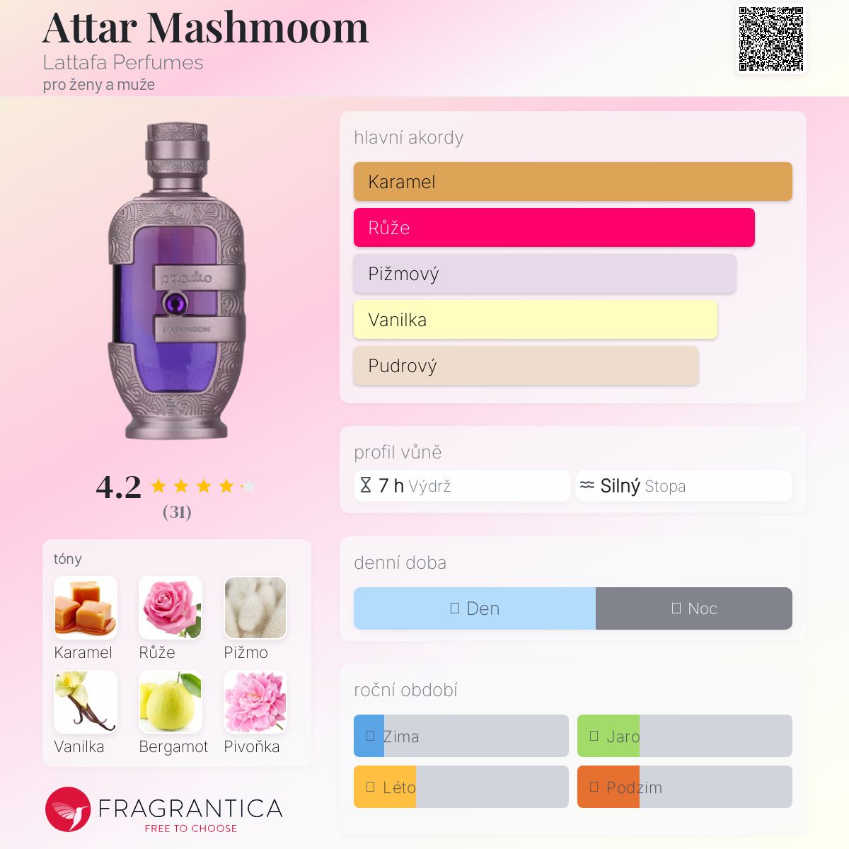 Attar Mashmoom podle Lattafa Perfumes je Floral Fruity Gourmand vůně pro ženy a muže. Toto je nová vůně. Attar Mashmoom byl/a uveden/a v roce 2025. Vrchní tóny jsou Růže a Bergamot; střední tóny jsouKaramel a Pivoňka ; základní tóny jsou Pižmo a Vanilka.
