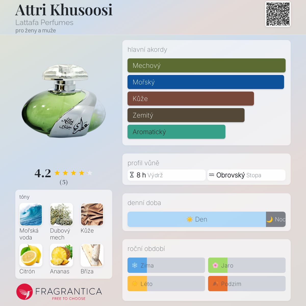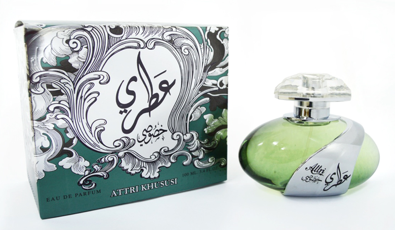 Attri Khusoosi podle Lattafa Perfumes je Orientální vůně pro ženy a muže. Vrchní tóny jsou Mořské tóny, Citrón a Ananas; střední tóny jsouBříza, Jasmín a Bobkový list ; základní tóny jsou Dubový mech, Kůže, Pačuli, Guajakové dřevo a Ambra.
