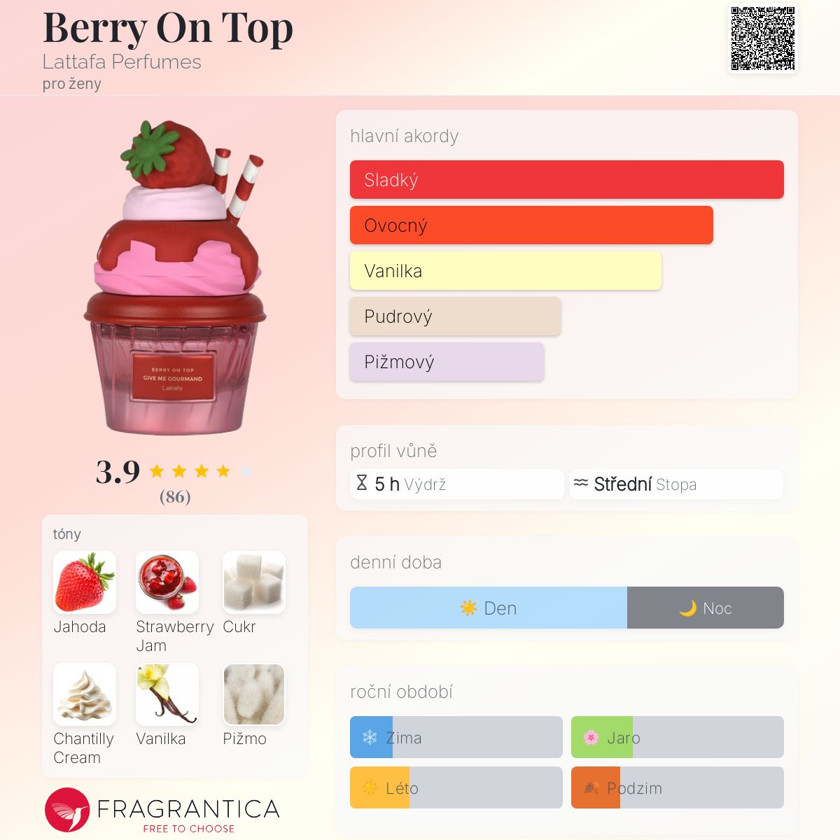 Berry On Top podle Lattafa Perfumes je Floral Fruity Gourmand vůně pro ženy. Toto je nová vůně. Berry On Top byl/a uveden/a v roce 2025. "Nosem" za touto vůní je Dalia Izem. Vrchní tóny jsou Jahoda a Šlehačka Chantilly; střední tóny jsouStrawberry Jam, Cukr a Bílé květy ; základní tóny jsou Vanilka a Pižmo.