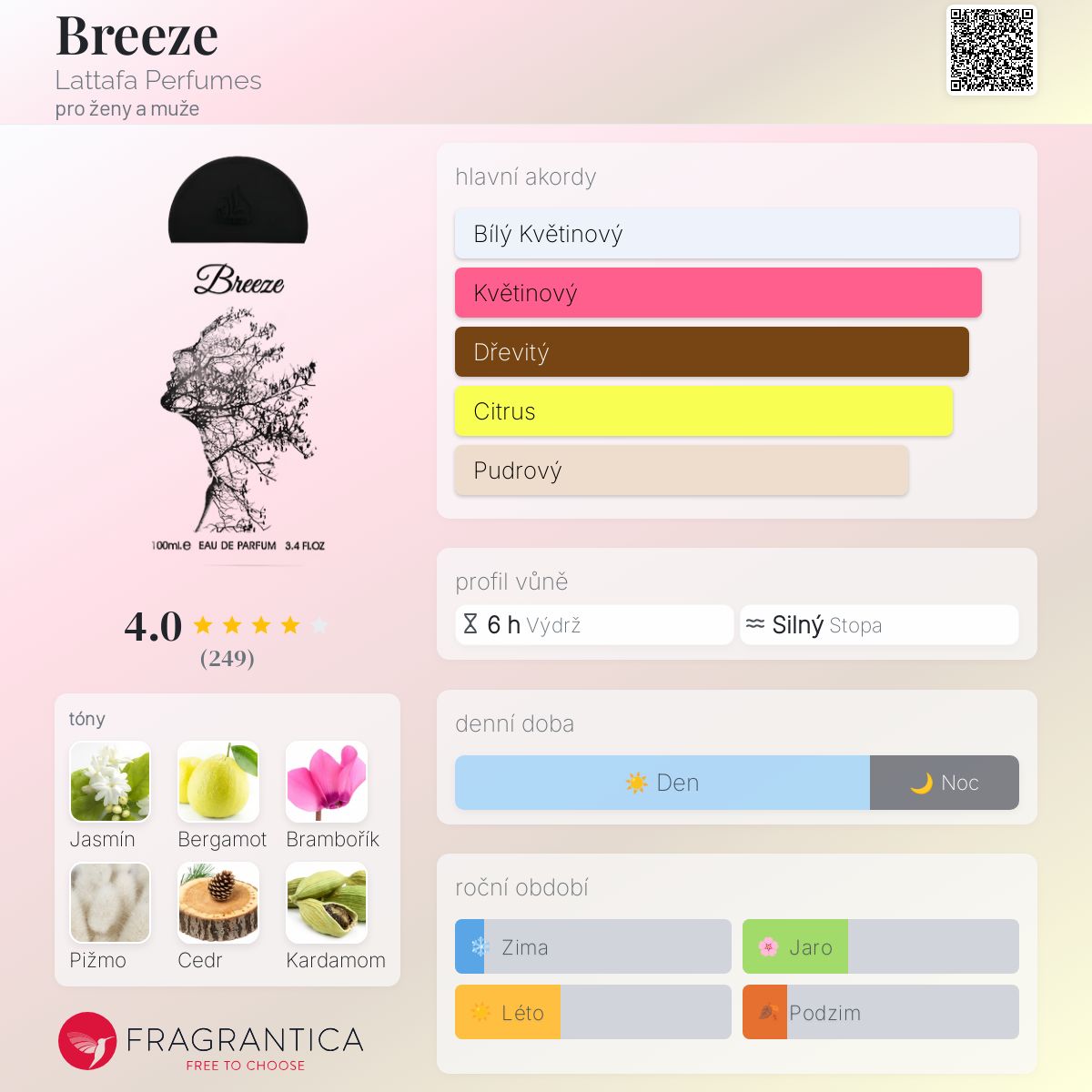 Breeze podle Lattafa Perfumes je Floral Woody Musk vůně pro ženy a muže. Toto je nová vůně. Breeze byl/a uveden/a v roce 2024. Vrchní tóny jsou Bergamot, Kardamom a Kadidlo; střední tóny jsouJasmín a Brambořík ; základní tóny jsou Pižmo, Cedr a Santalové dřevo.