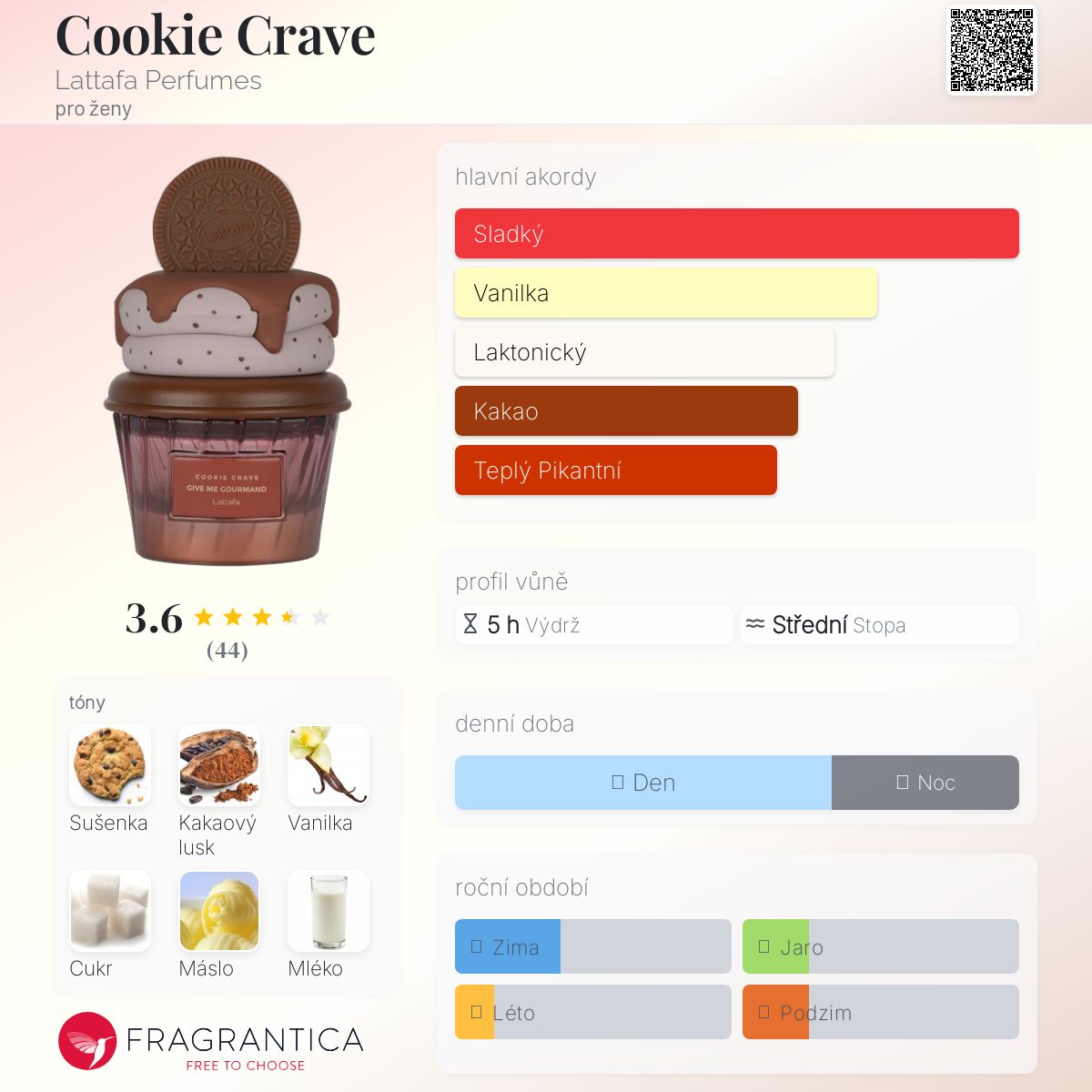 Cookie Crave podle Lattafa Perfumes je Orientální Vanilla vůně pro ženy. Toto je nová vůně. Cookie Crave byl/a uveden/a v roce 2025. Vrchní tóny jsou Kakao a Máslo; střední tóny jsouSušenka, Cukr a Mléko ; základní tóny jsou Vanilka, Šlehačka a Santalové dřevo.