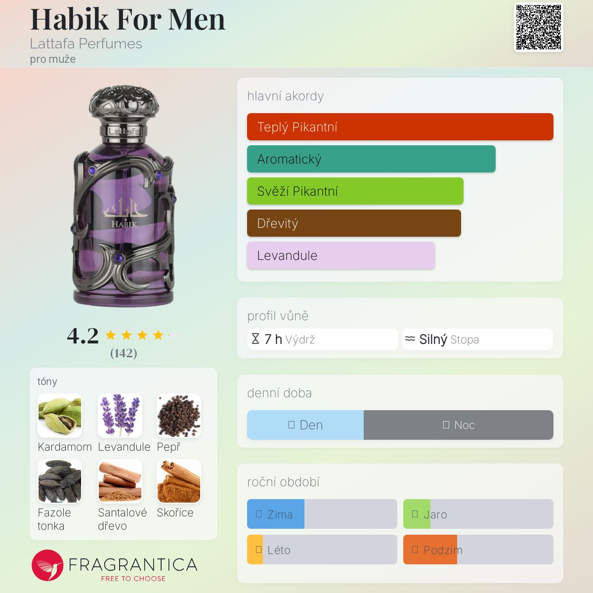 Habik For Men podle Lattafa Perfumes je Woody Aromatic vůně pro muže. Toto je nová vůně. Habik For Men byl/a uveden/a v roce 2025. Vrchní tóny jsou Kardamom, Pepř, Pelyněk a Bergamot; střední tóny jsouLevandule, Skořice a Šalvěj ; základní tóny jsou Fazole tonka, Santalové dřevo, Pačuli, Pižmo a Jantarové dřevo.