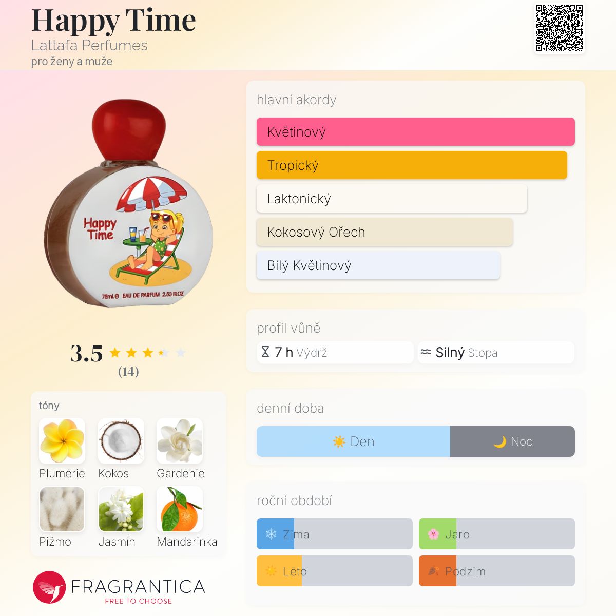 Happy Time podle Lattafa Perfumes je Floral Fruity vůně pro ženy a muže. Toto je nová vůně. Happy Time byl/a uveden/a v roce 2024. Vrchní tón je Mandarinka ; střední tóny jsouPlumérie, Gardénie a Jasmín ; základní tóny jsou Kokos, Pižmo a Pačuli.