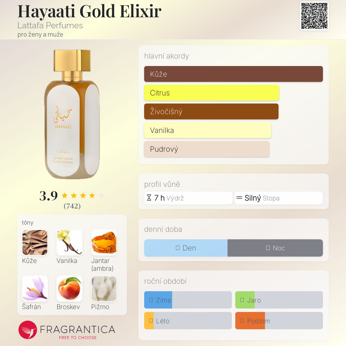 Hayaati Gold Elixir podle Lattafa Perfumes je vůně pro ženy a muže. Vrchní tóny jsou Bergamot, Grapefruit a Černý rybíz; střední tóny jsouKůže, Broskev a Šafrán ; základní tóny jsou Vanilka, Jantar (ambra), Pižmo a Vetiver.