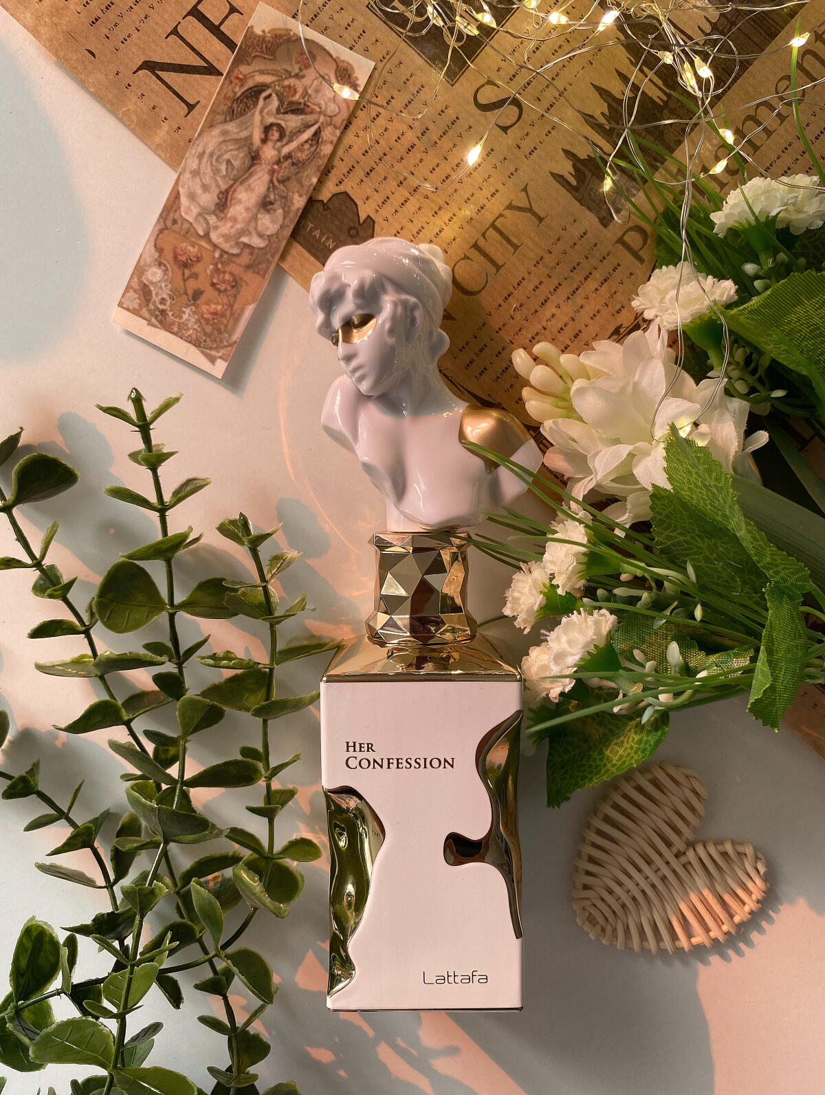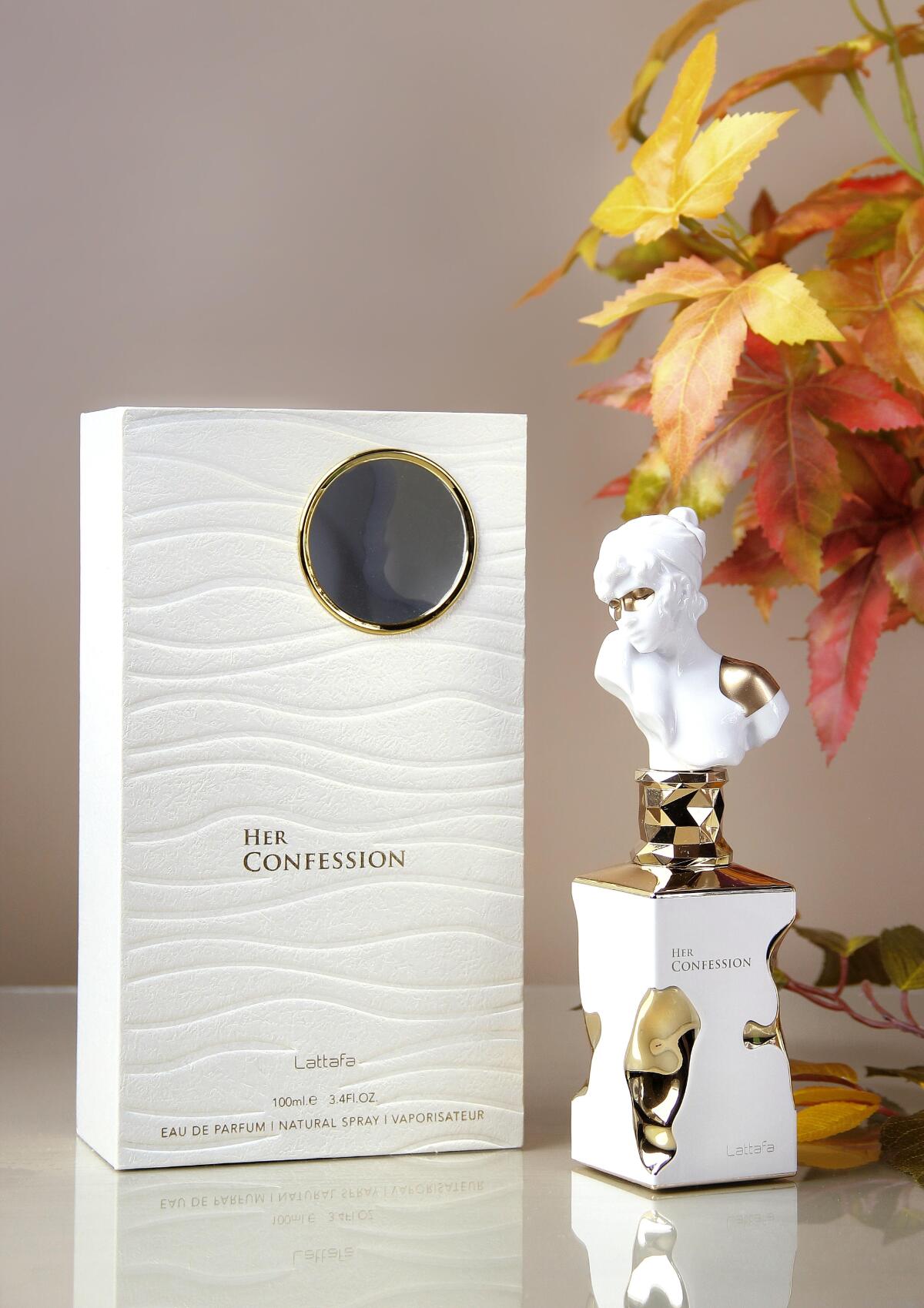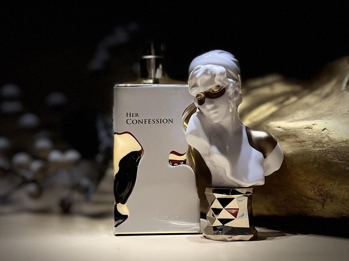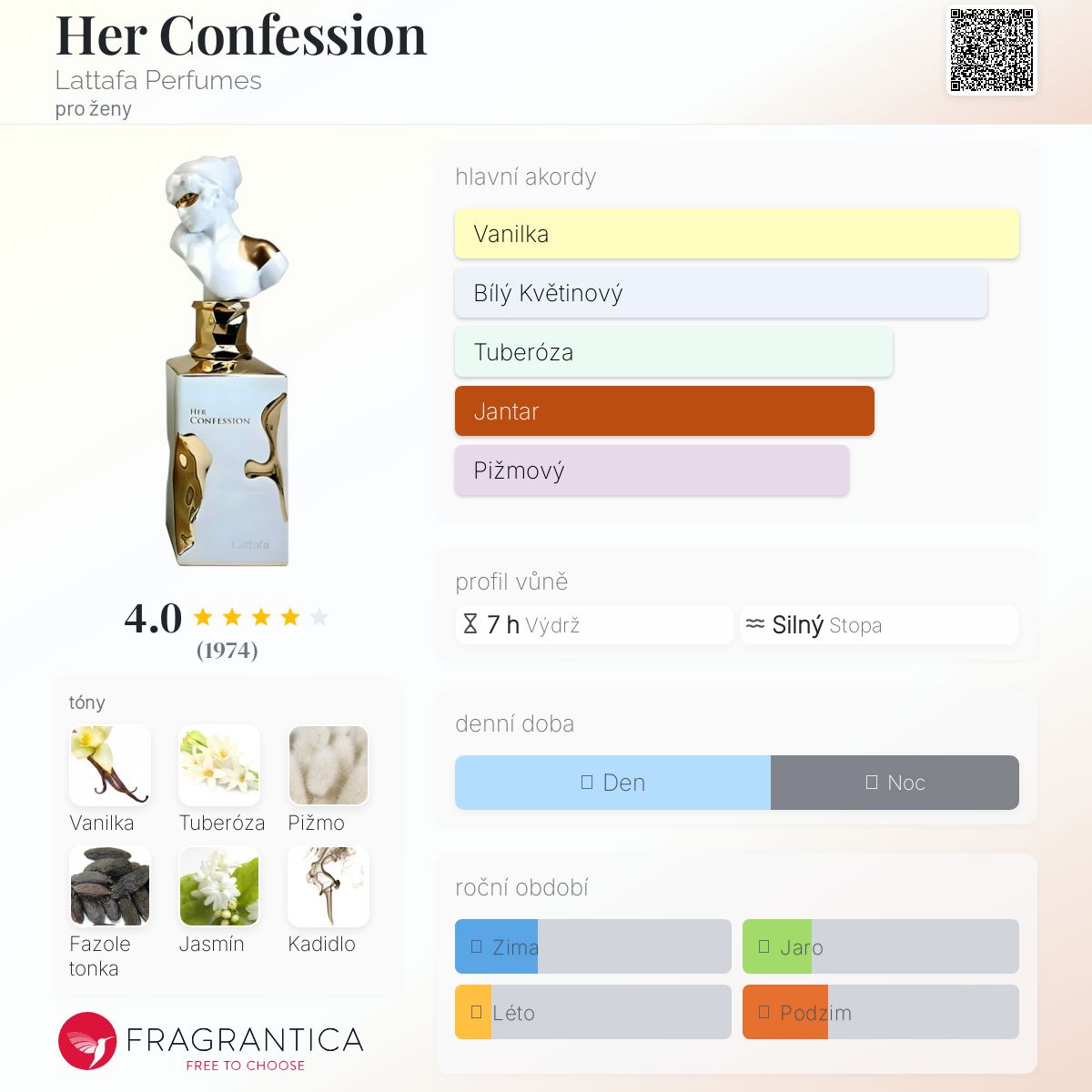 Her Confession podle Lattafa Perfumes je vůně pro ženy. Toto je nová vůně. Her Confession byl/a uveden/a v roce 2024. Vrchní tóny jsou Mystikal a Skořice; střední tóny jsouTuberóza, Jasmín, Kadidlo a Mahonial ; základní tóny jsou Vanilka, Pižmo a Fazole tonka.