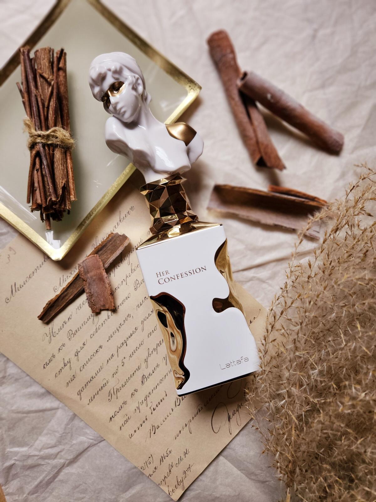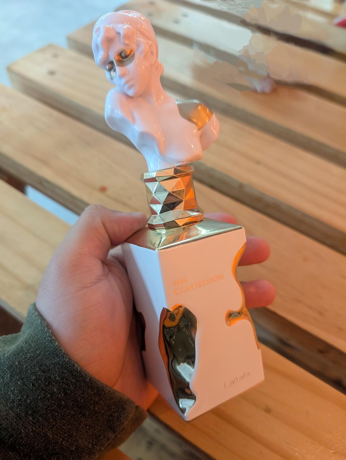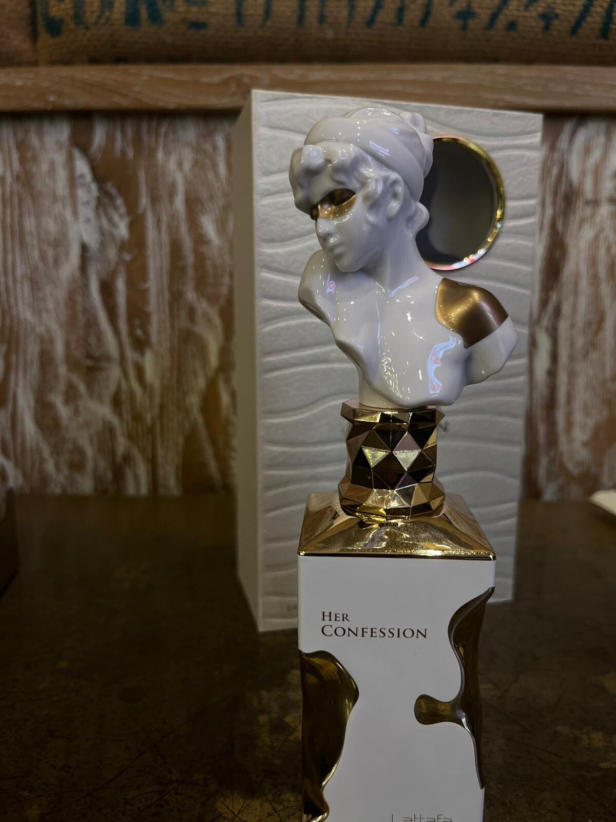 Her Confession podle Lattafa Perfumes je vůně pro ženy. Toto je nová vůně. Her Confession byl/a uveden/a v roce 2024. Vrchní tóny jsou Mystikal a Skořice; střední tóny jsouTuberóza, Jasmín, Kadidlo a Mahonial ; základní tóny jsou Vanilka, Pižmo a Fazole tonka.