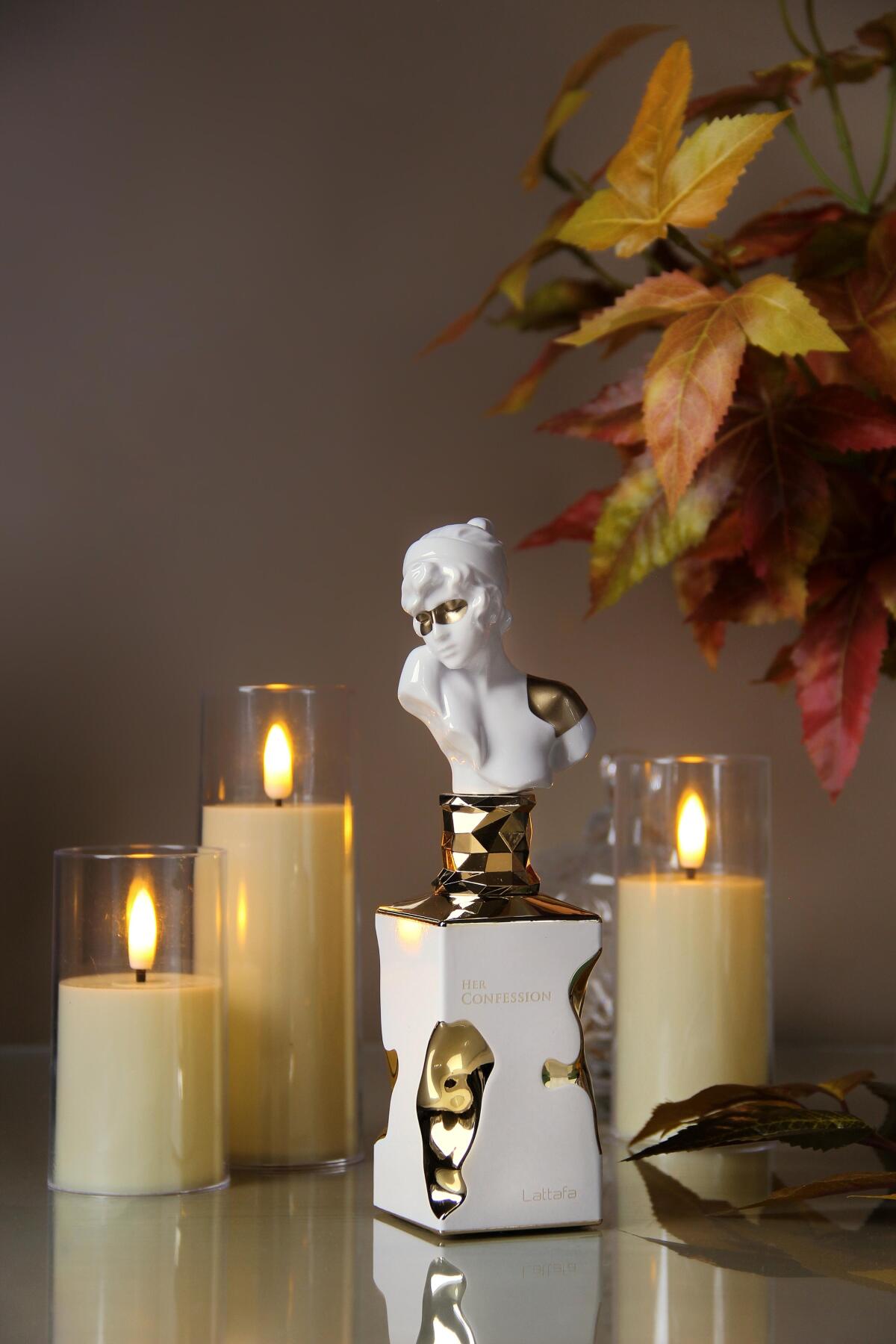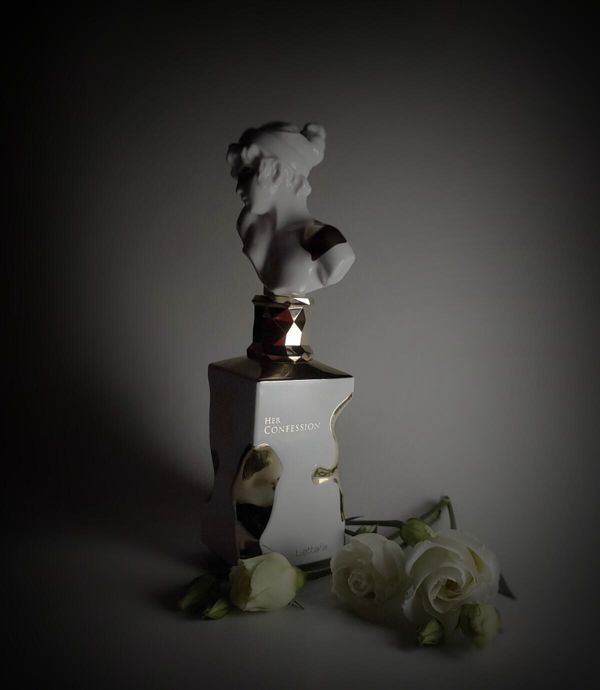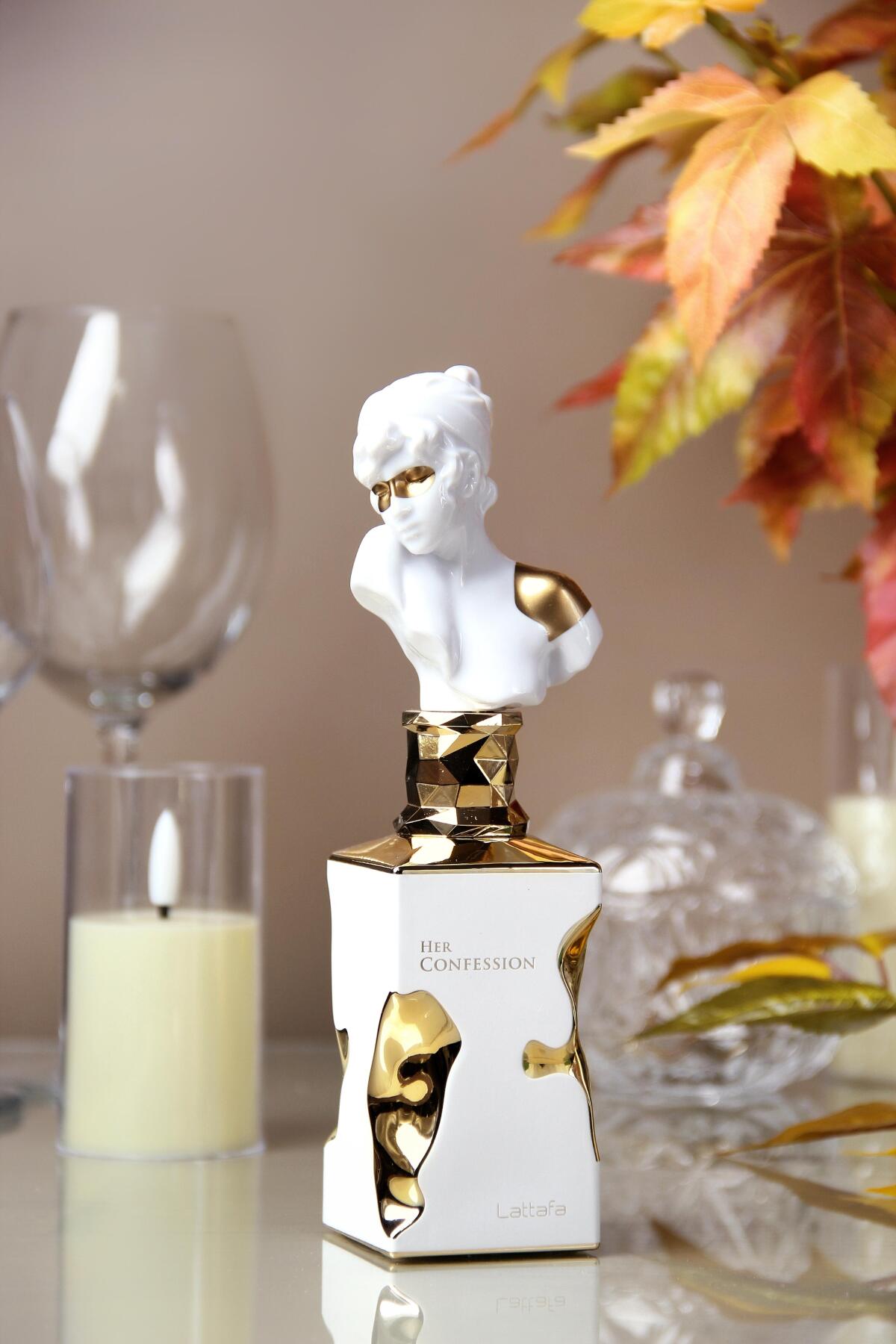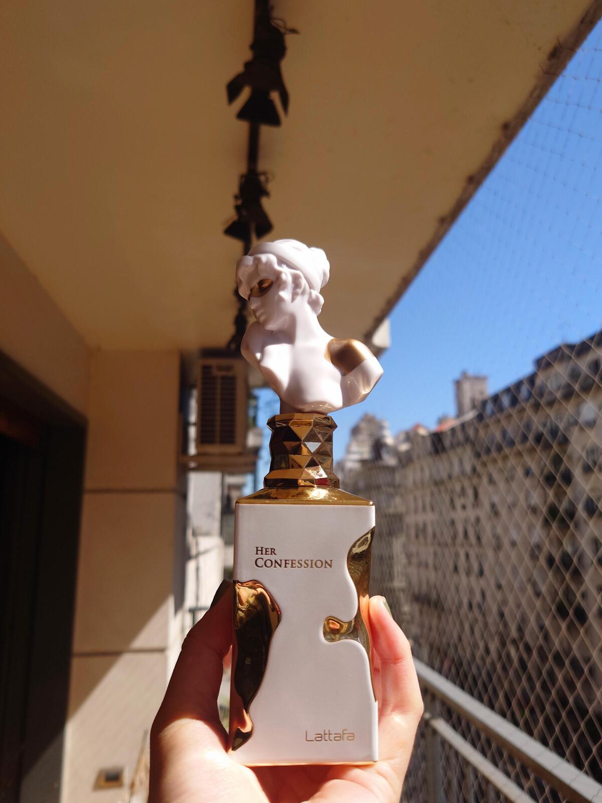 Her Confession podle Lattafa Perfumes je vůně pro ženy. Toto je nová vůně. Her Confession byl/a uveden/a v roce 2024. Vrchní tóny jsou Mystikal a Skořice; střední tóny jsouTuberóza, Jasmín, Kadidlo a Mahonial ; základní tóny jsou Vanilka, Pižmo a Fazole tonka.