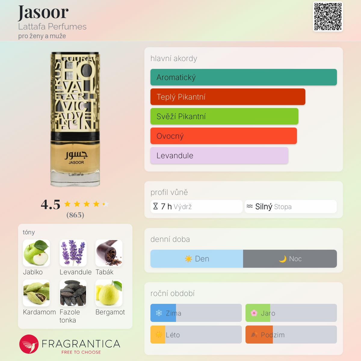 Jasoor podle Lattafa Perfumes je vůně pro ženy a muže. Jasoor byl/a uveden/a v roce 2023. Vrchní tóny jsou Jablko, Kardamom a Bergamot; střední tóny jsouLevandule, Tabák a Pelargónie ; základní tóny jsou Fazole tonka, Kůže, Vetiver a Pačuli.