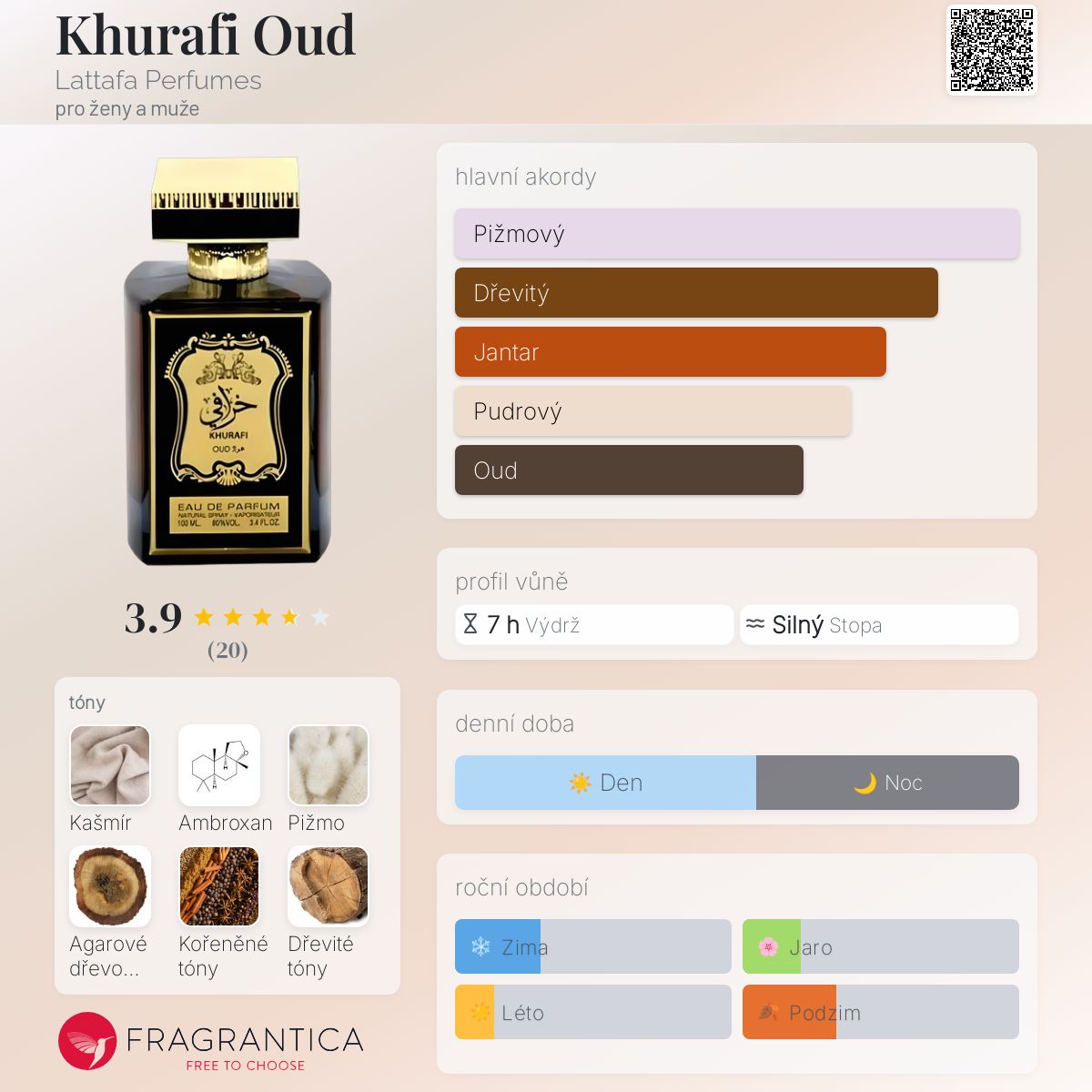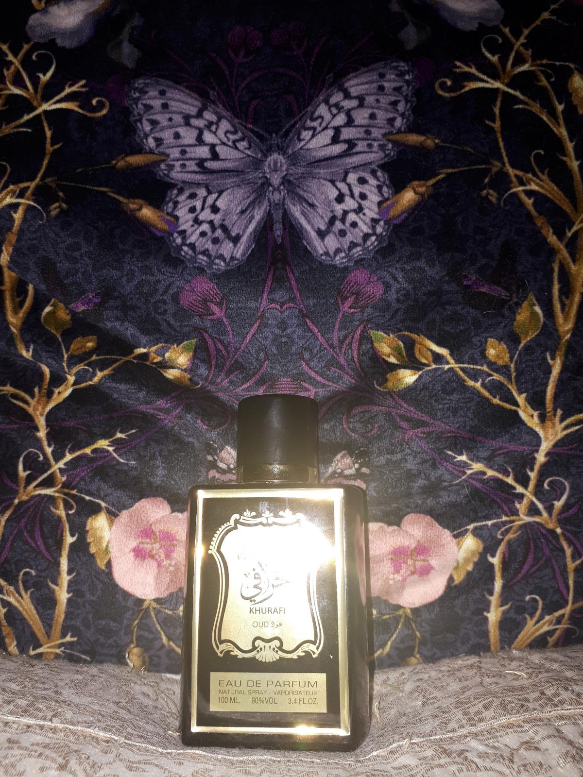 Khurafi Oud podle Lattafa Perfumes je Woody vůně pro ženy a muže. Khurafi Oud byl/a uveden/a v roce 2019. Vrchní tóny jsou Agarové dřevo (oud) a Aromatické koření; střední tóny jsouAgarové dřevo (oud) a Dřevité tóny ; základní tóny jsou Kašmír, Ambroxan a Pižmo.