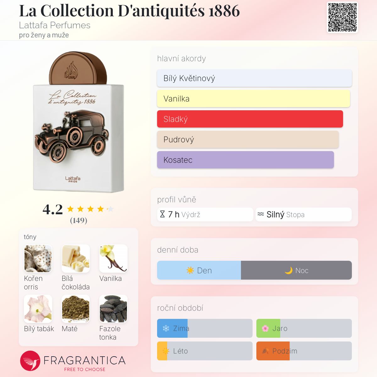 La Collection D'antiquités 1886 podle Lattafa Perfumes je Aromatic vůně pro ženy a muže. La Collection D'antiquités 1886 byl/a uveden/a v roce 2023. Vrchní tóny jsou Maté a Bergamot; střední tóny jsouOrris, Fazole tonka, Skořice, Jasmín a Kůra ; základní tóny jsou Bílá čokoláda, Vanilka, Bílý tabák, Bílé pižmo a Pačuli.