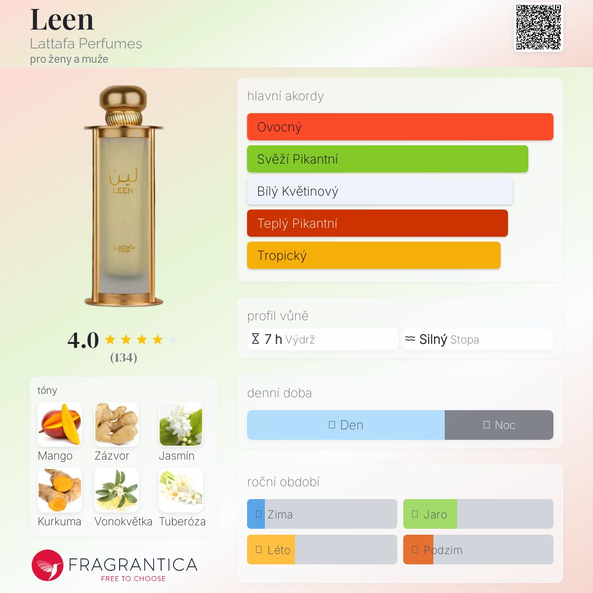 Leen podle Lattafa Perfumes je Orientální Floral vůně pro ženy a muže. Leen byl/a uveden/a v roce 2023. Vrchní tóny jsou Zázvor, Kurkuma, Bergamot a Růžový pepř; střední tóny jsouMango, Jasmín, Vonokvětka, Tuberóza a Černý pepř ; základní tóny jsou Santalové dřevo, Pižmo a Kadidlo.