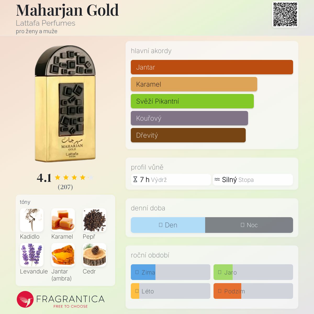 Maharjan Gold podle Lattafa Perfumes je vůně pro ženy a muže. Maharjan Gold byl/a uveden/a v roce 2022. Vrchní tóny jsou Pepř a Levandule; střední tóny jsouKadidlo, Tuberóza a Jasmín ; základní tóny jsou Karamel, Jantar (ambra), Cedr a Kašmír.
