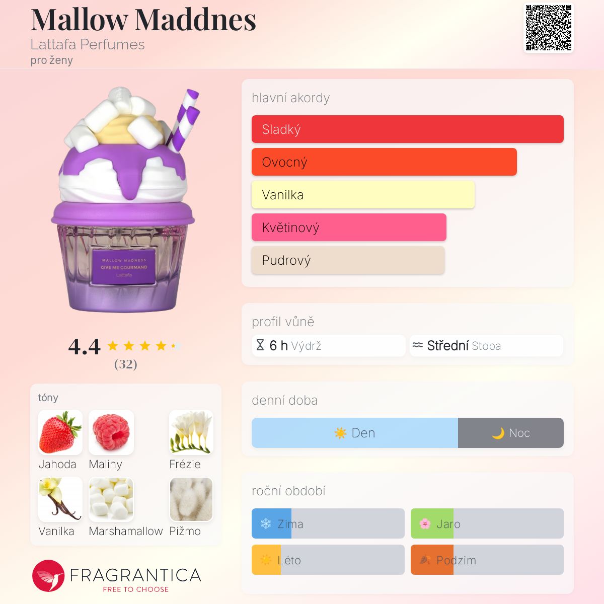 Mallow Maddnes podle Lattafa Perfumes je Floral Fruity Gourmand vůně pro ženy. Toto je nová vůně. Mallow Maddnes byl/a uveden/a v roce 2025. "Nosem" za touto vůní je Nanako Ogi. Vrchní tóny jsou Jahoda a Maliny; střední tóny jsouMarshamallow a Frézie ; základní tóny jsou Vanilka, Šlehačka a Pižmo.