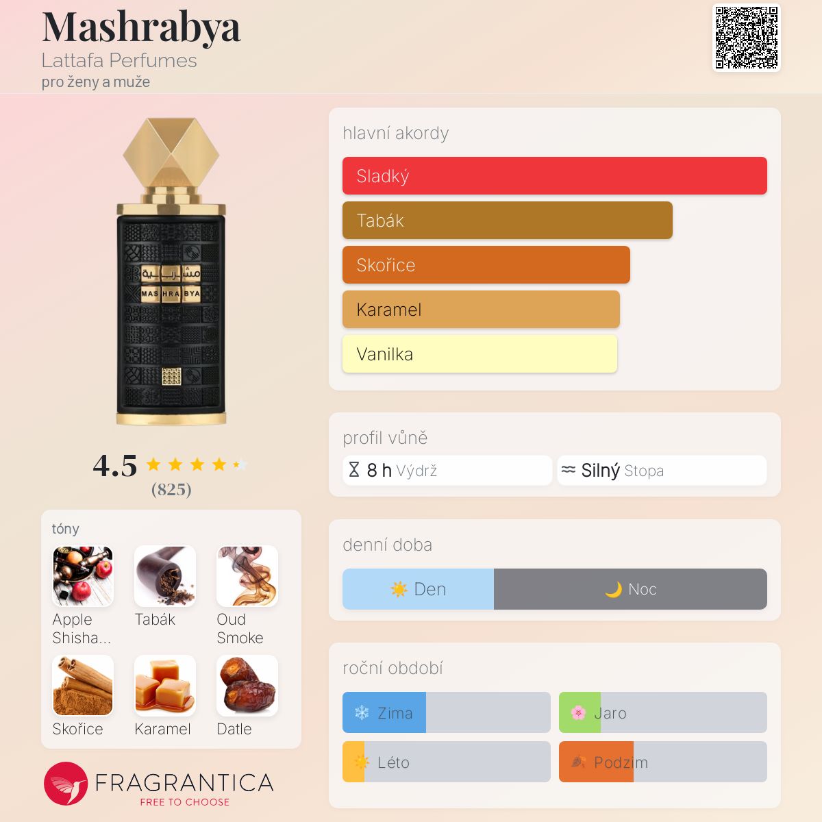 Mashrabya podle Lattafa Perfumes je Orientální Vanilla vůně pro ženy a muže. Toto je nová vůně. Mashrabya byl/a uveden/a v roce 2024. Vrchní tóny jsou Akord jablečné šíši (vodní dýmky) a Růžový pepř; střední tóny jsouTabák, Skořice a Datle ; základní tóny jsou Oud Smoke, Karamel, Vanilka a Pačuli.