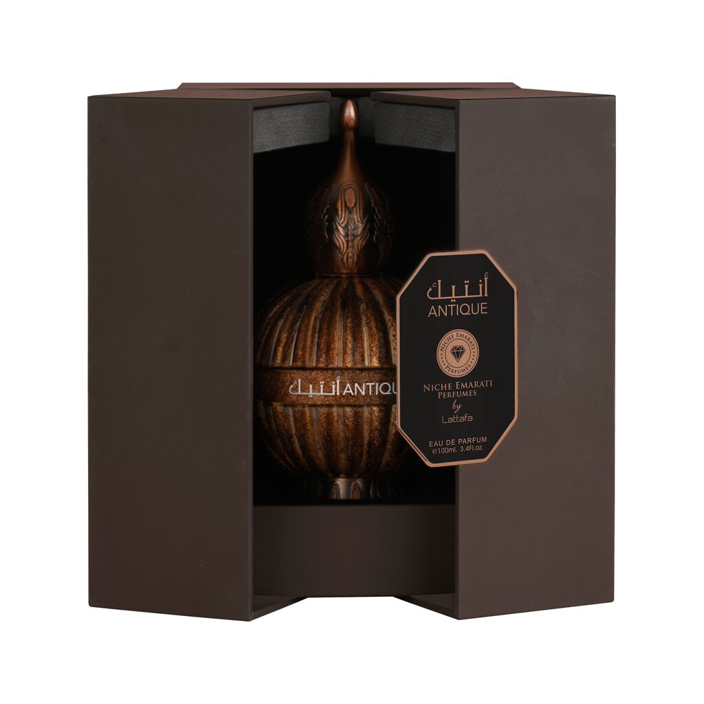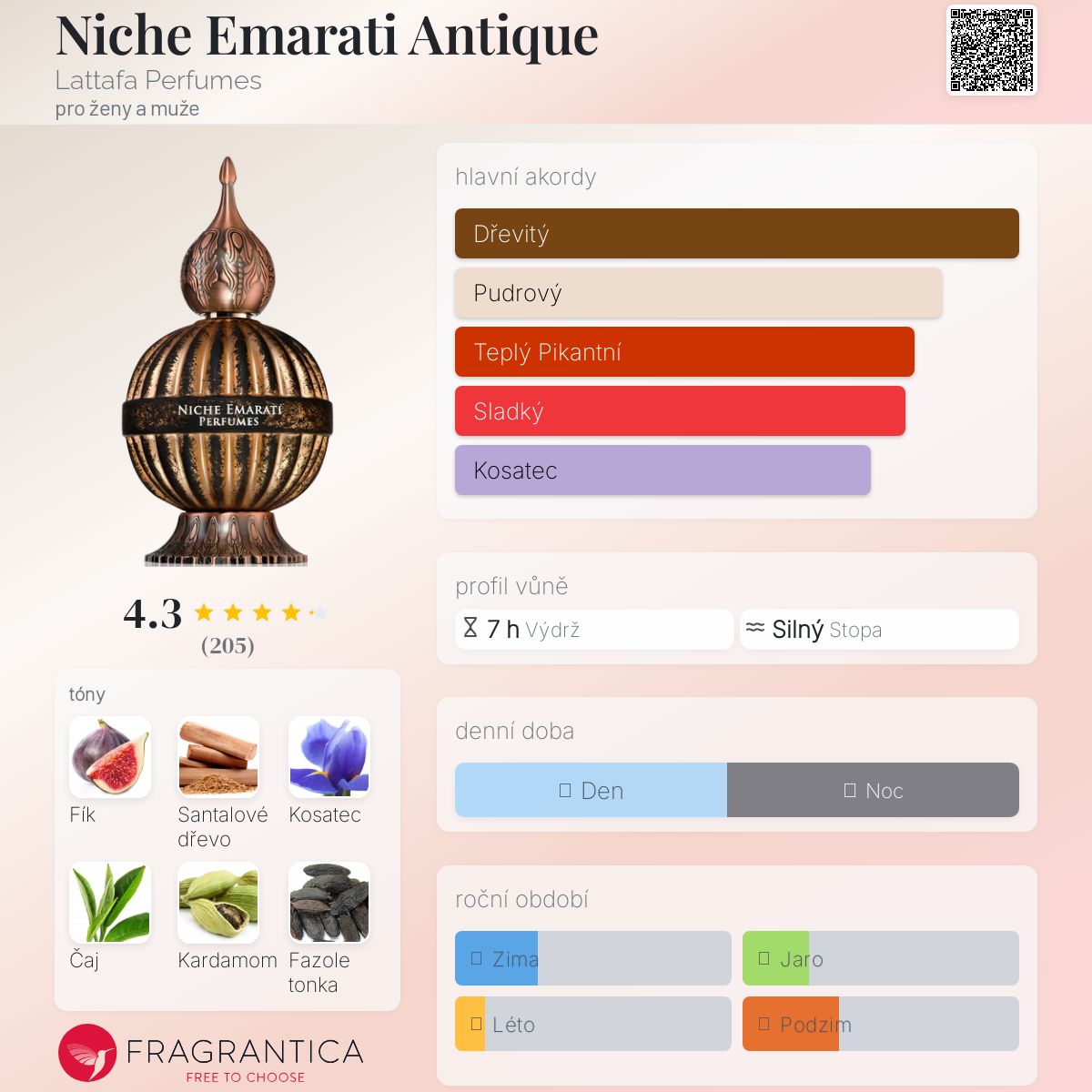 Niche Emarati Antique podle Lattafa Perfumes je Orientální Woody vůně pro ženy a muže. Toto je nová vůně. Niche Emarati Antique byl/a uveden/a v roce 2024. Vrchní tóny jsou Fík, Černý čaj, Kardamom, Mléko a Kokos; střední tóny jsouKosatec, Vetiver a Jasmín ; základní tóny jsou Santalové dřevo, Fazole tonka, Jantar (ambra), Pižmo a Karamel.