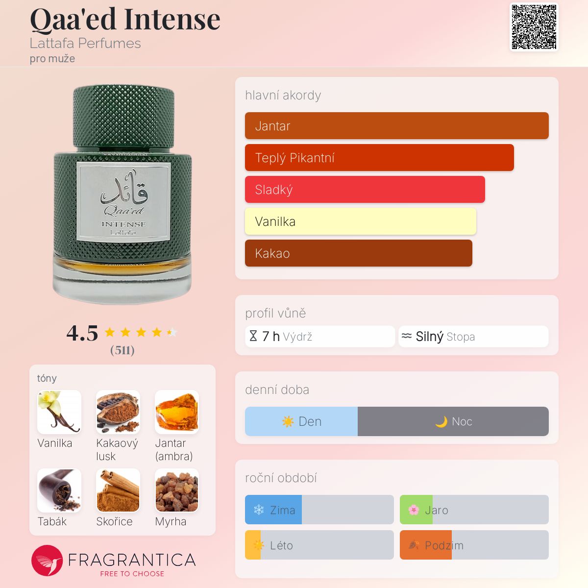 Qaa'ed Intense podle Lattafa Perfumes je Orientální Spicy vůně pro muže. Toto je nová vůně. Qaa'ed Intense byl/a uveden/a v roce 2024. Vrchní tóny jsou Tabák, Skořice a Bílý med; střední tóny jsouVanilka, Kakao, Myrha a Pačuli ; základní tóny jsou Jantar (ambra), Francouzské labdanum a Styrax.