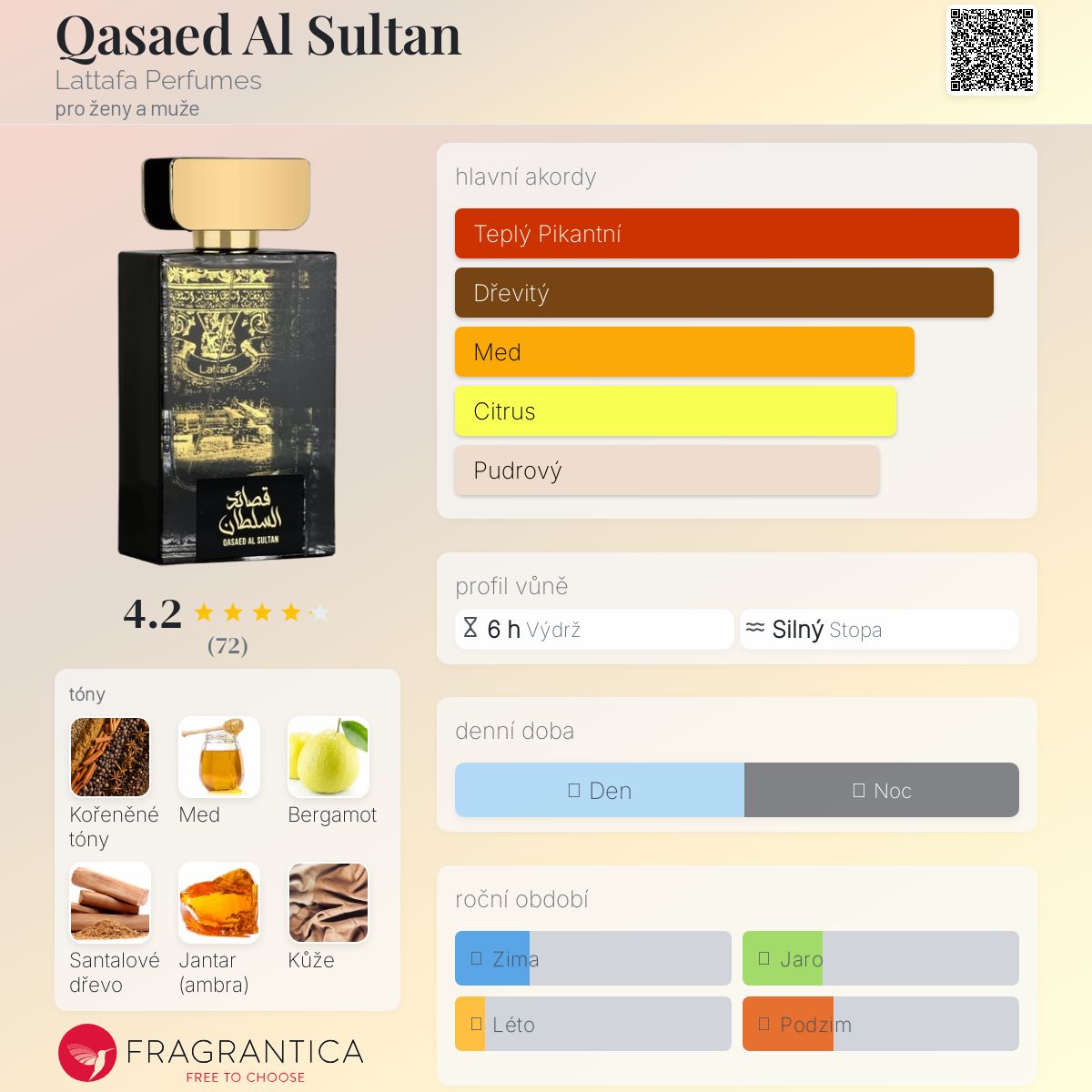 Qasaed Al Sultan podle Lattafa Perfumes je Leather vůně pro ženy a muže. Qasaed Al Sultan byl/a uveden/a v roce 2022. Vrchní tóny jsou Bergamot a Jantar (ambra); střední tóny jsouKoření, Med a Kůže ; základní tóny jsou Santalové dřevo, Pačuli, Vanilka a Agarové dřevo (oud).