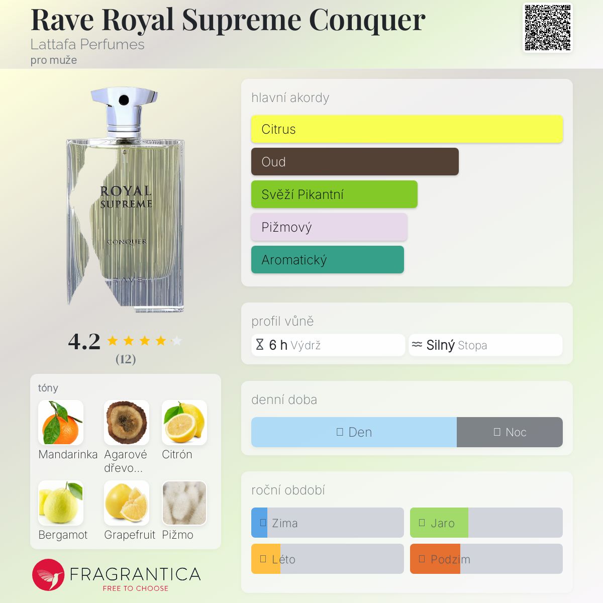 Rave Royal Supreme Conquer podle Lattafa Perfumes je Woody Aromatic vůně pro muže. Toto je nová vůně. Rave Royal Supreme Conquer byl/a uveden/a v roce 2024. Vrchní tón je Bergamot ; střední tóny jsouMandarinka, Citrón a Grapefruit ; základní tóny jsou Agarové dřevo (oud) a Pižmo.