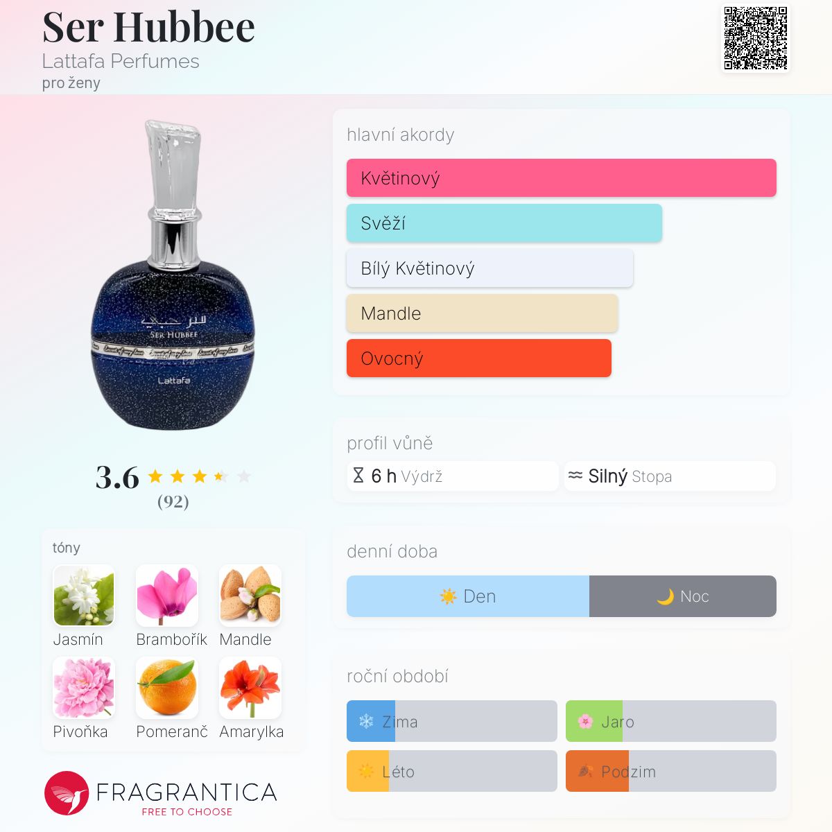 Hodně mi připomíná vůni Fakhar Rose/Woman od Lattafy. Myslím, že mají společné tóny pižma, vanilky a pivoňky. Ale je úplně jiná. Má lahodný gurmánský máslový mandlový tón a svěžest cyklámenu. Je opravdu nádherná. Není příliš silná ani přeplácaná. Jediné, co bych jí vytkla, je to, že mi nepřipadá, že vydrží tak dlouho jako některé jiné Lattafy, ale za tu cenu je to opravdu skvělá hodnota. Miluju ji! Opravdu jsem s ní spokojená a lahvička je nádherná!!!