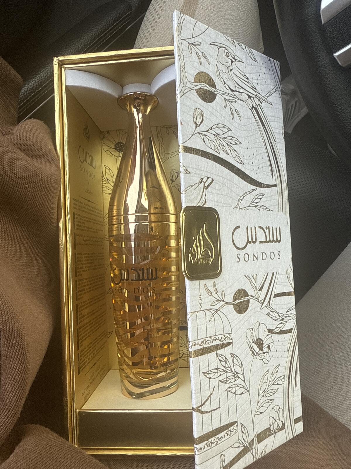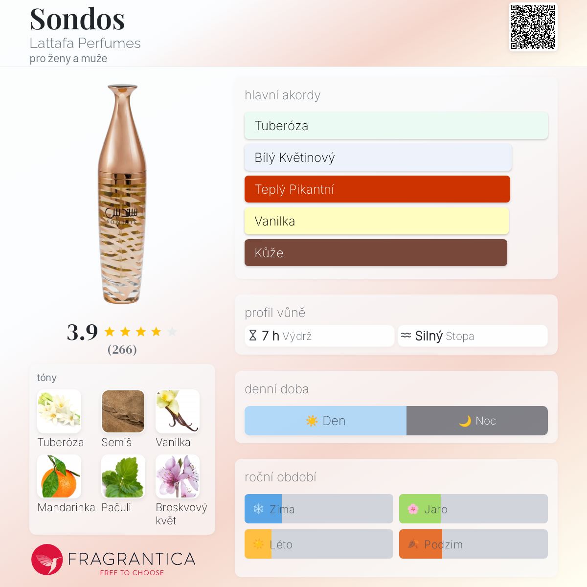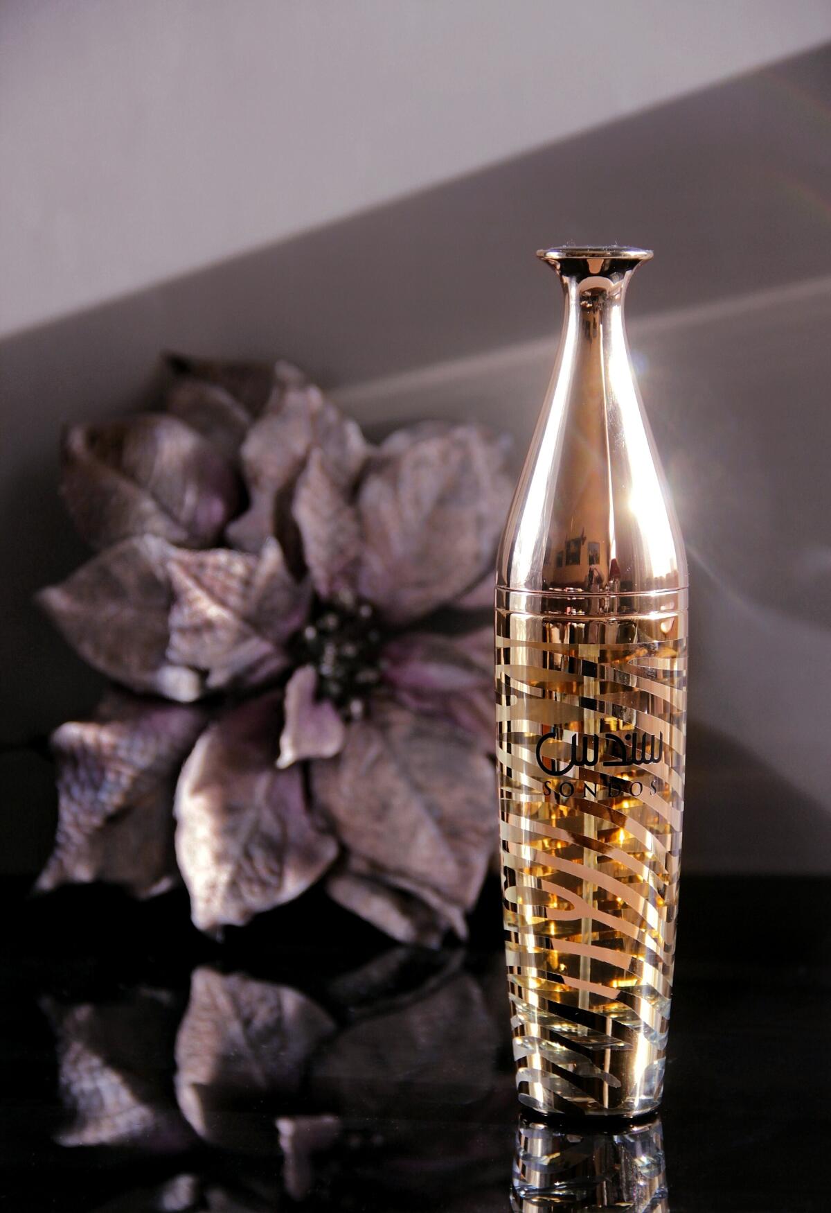 Sondos podle Lattafa Perfumes je vůně pro ženy a muže. Sondos byl/a uveden/a v roce 2023. "Nosem" za touto vůní je Alex Lee. Vrchní tóny jsou Mandarinka a Šafrán; střední tóny jsouTuberóza, Broskvový květ a Růže ; základní tóny jsou Semiš, Vanilka a Pačuli.