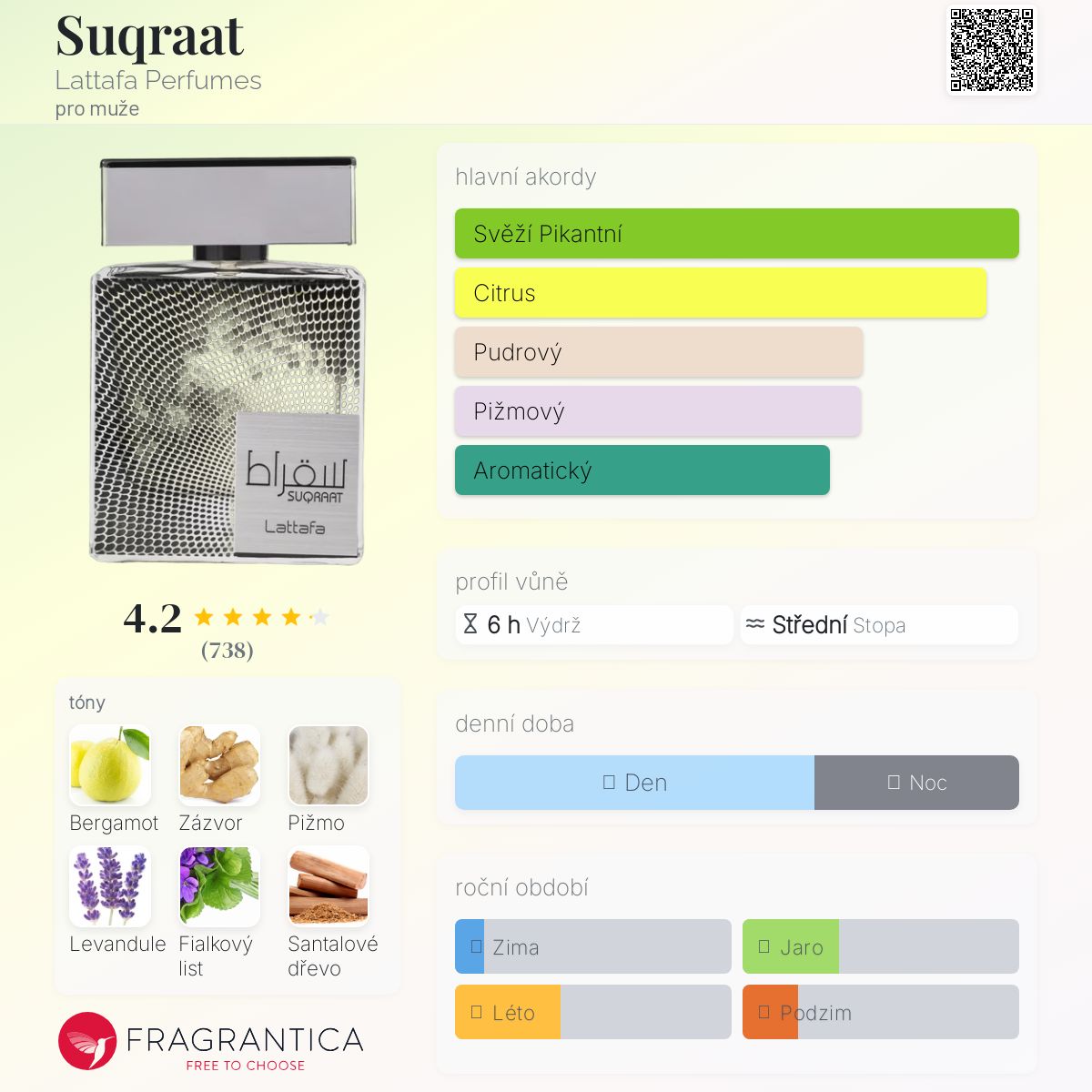 Suqraat podle Lattafa Perfumes je Aromatic vůně pro muže. Suqraat byl/a uveden/a v roce 2022. Vrchní tóny jsou Bergamot a Zázvor; střední tóny jsouLevandule a Fialkový list ; základní tóny jsou Pižmo, Santalové dřevo a Jantar (ambra).
