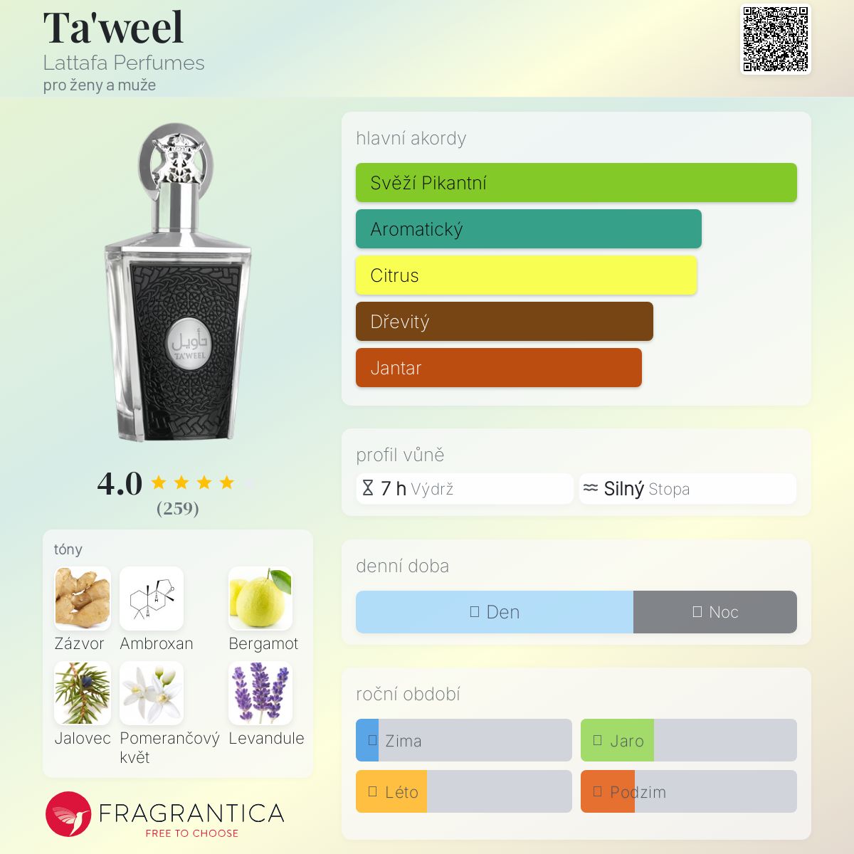 Ta'weel podle Lattafa Perfumes je vůně pro ženy a muže. Ta'weel byl/a uveden/a v roce 2023. Vrchní tóny jsou Zázvor, Bergamot, Jalovec a Muškátový oříšek; střední tóny jsouPomerančový květ a Levandule ; základní tóny jsou Ambroxan, Kůže, Vetiver a Pačuli.