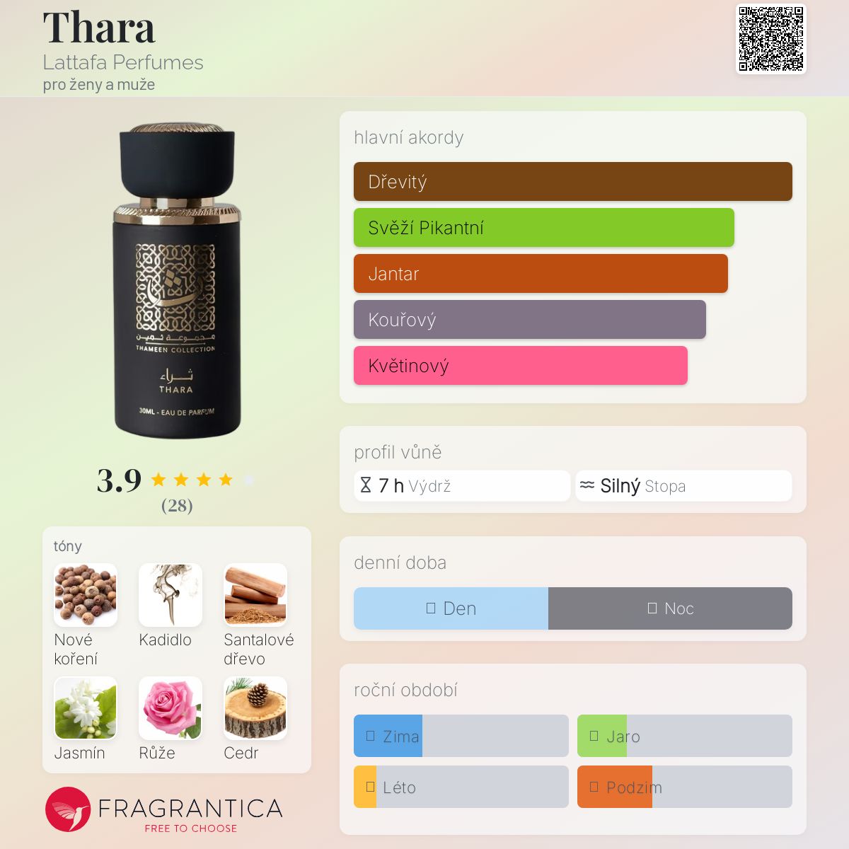 Thara podle Lattafa Perfumes je vůně pro ženy a muže. Vrchní tóny jsou Nové koření a Frézie; střední tóny jsouJasmín, Bulharská růže, Květ ibišku a Otočník ; základní tóny jsou Kadidlo, Santalové dřevo a Himalájský cedr.