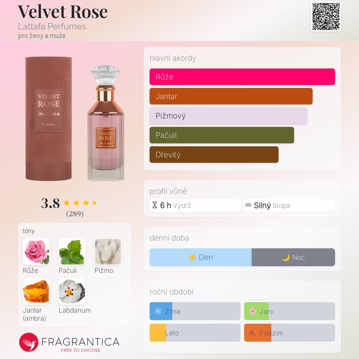 Velvet Rose podle Lattafa Perfumes je vůně pro ženy a muže. Vrchní tóny jsou Růže a Pačuli; střední tóny jsouPižmo a Labdanum ; základní tóny jsou Pižmo a Jantar (ambra).