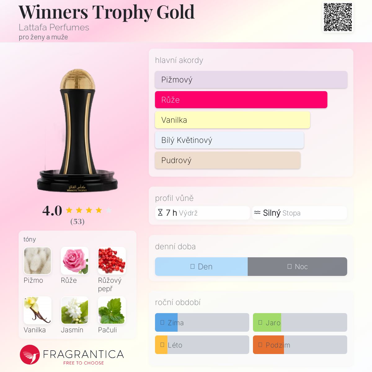 Winners Trophy Gold podle Lattafa Perfumes je vůně pro ženy a muže. Winners Trophy Gold byl/a uveden/a v roce 2022. Vrchní tón je Růžový pepř ; střední tóny jsouRůže a Jasmín ; základní tóny jsou Pižmo, Vanilka a Pačuli.