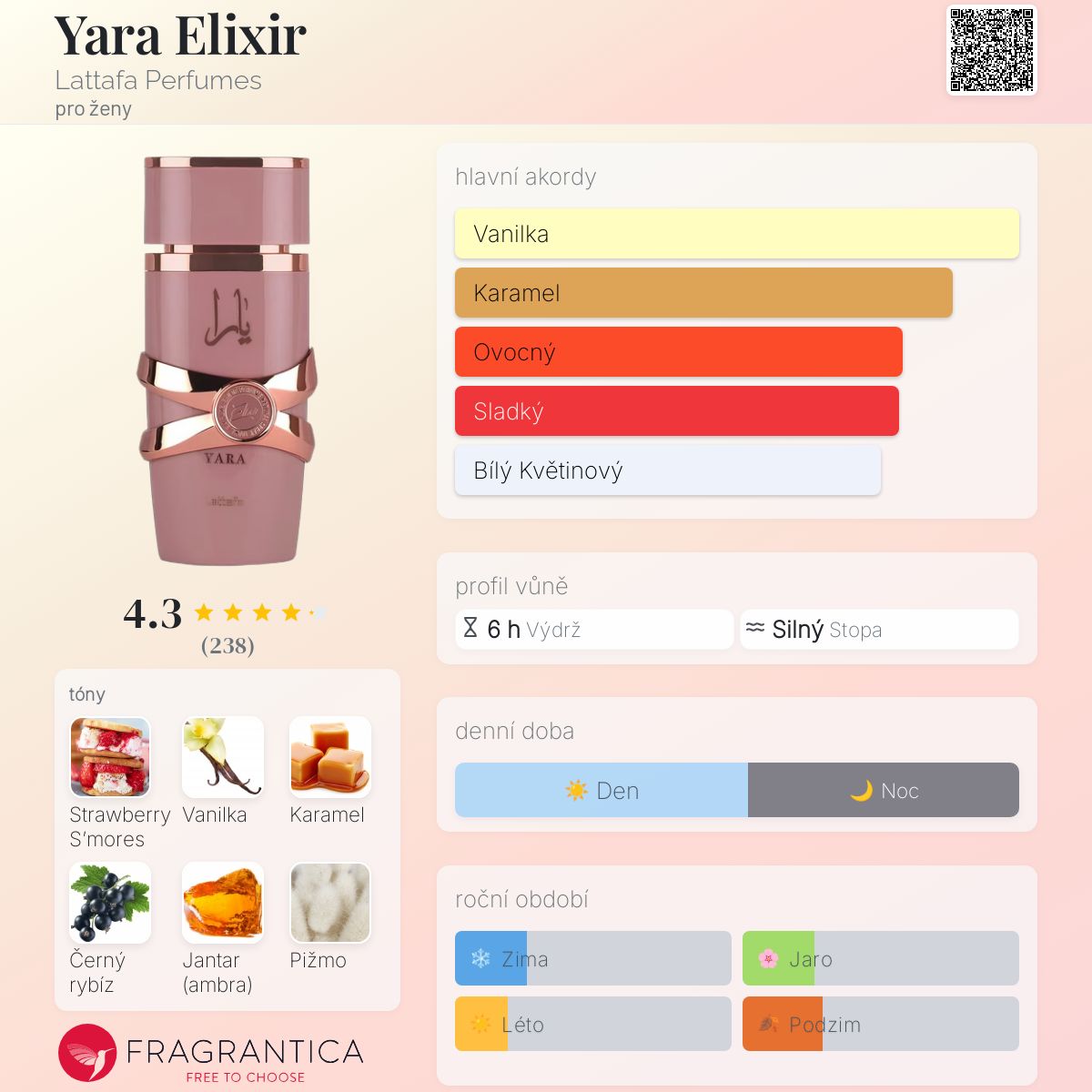 Yara Elixir podle Lattafa Perfumes je Orientální Vanilla vůně pro ženy. Toto je nová vůně. Yara Elixir byl/a uveden/a v roce 2025. Vrchní tóny jsou Strawberry S’mores a Černý rybíz; střední tóny jsouJasmín a Pomerančový květ ; základní tóny jsou Vanilka, Karamel, Jantar (ambra) a Pižmo.
