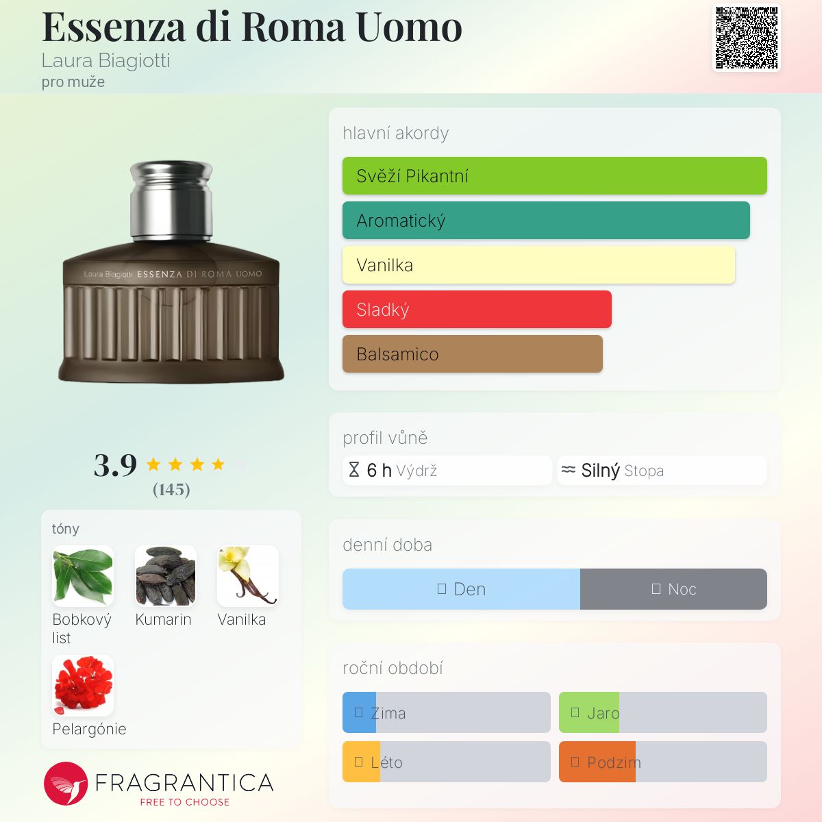 Essenza di Roma Uomo podle Laura Biagiotti je Woody Aromatic vůně pro muže. Essenza di Roma Uomo byl/a uveden/a v roce 2013. Vrchní tón je Bobkový list ; střední tón jePelargónie ; základní tóny jsou Kumarin a Vanilka.