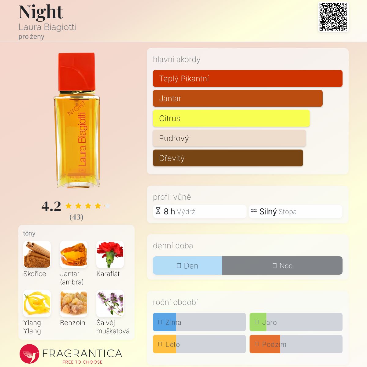 Night podle Laura Biagiotti je Orientální Spicy vůně pro ženy. Night byl/a uveden/a v roce 1985. Vrchní tóny jsou Šalvěj muškátová, Ovocné tóny, Pomeranč, Bergamot, Aldehydy a Citron amalfi; střední tóny jsouSkořice, Karafiát, Ylang-Ylang, Tuberóza, Jasmín, Kořen orris a Růže ; základní tóny jsou Jantar (ambra), Benzoin, Cibetka, Santalové dřevo, Vanilka, Pačuli a Pižmo.