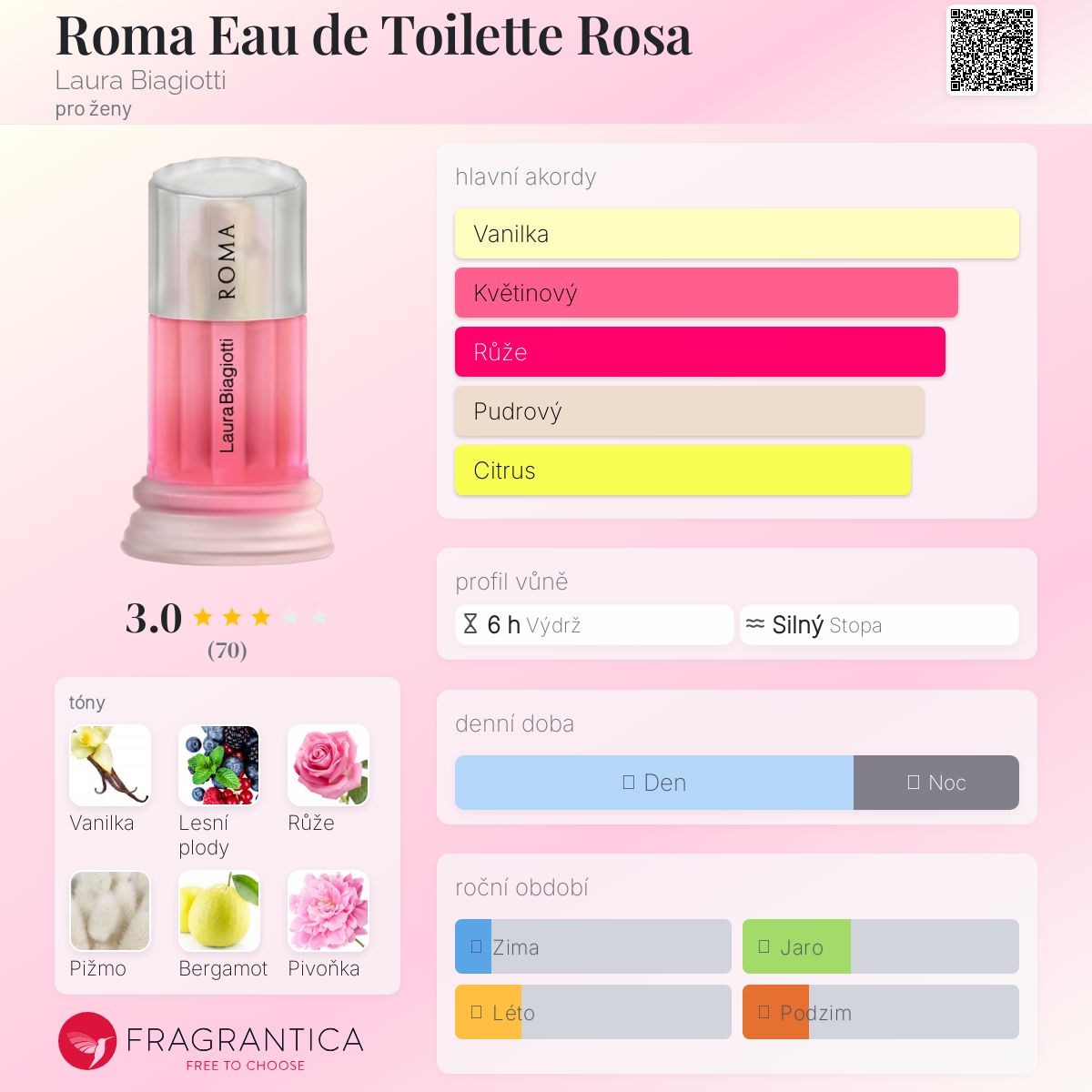 Roma Eau de Toilette Rosa podle Laura Biagiotti je Floral Fruity vůně pro ženy. Roma Eau de Toilette Rosa byl/a uveden/a v roce 2017. "Nosem" za touto vůní je Domitille Michalon Bertier. Vrchní tóny jsou Lesní plody a Bergamot; střední tóny jsouRůže, Pivoňka, Jasmín a Neroli ; základní tóny jsou Vanilka, Pižmo a Santalové dřevo.