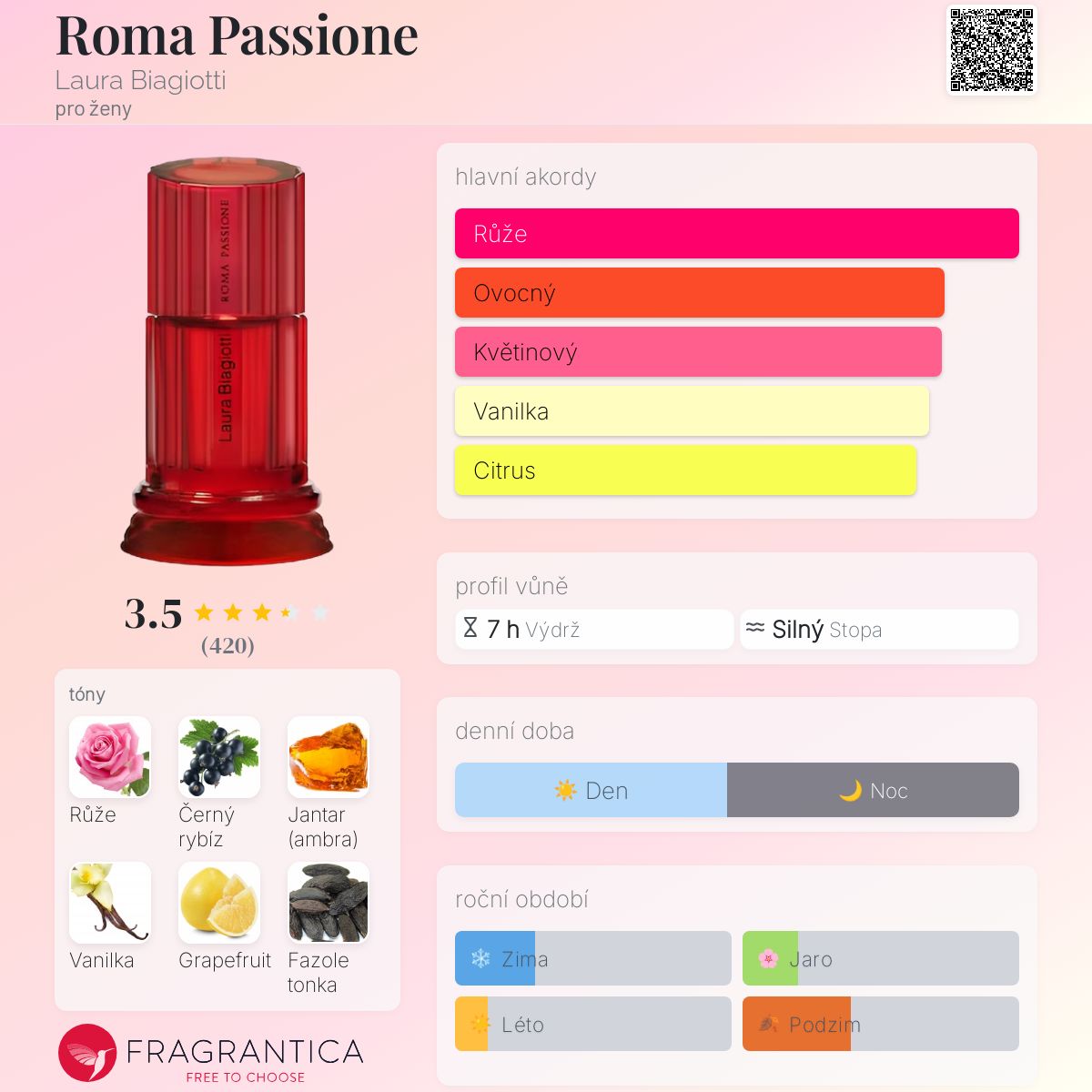 Roma Passione podle Laura Biagiotti je Floral Fruity vůně pro ženy. Roma Passione byl/a uveden/a v roce 2016. Roma Passione byl/a vytvořen/a Juliette Karagueuzoglou a Nicolas Beaulieu. Vrchní tóny jsou Černý rybíz, Růžový grapefruit a Italská mandarinka; střední tóny jsouRůže, Pivoňka a Jasmín ; základní tóny jsou Jantar (ambra), Vanilka, Fazole tonka a Pižmo.