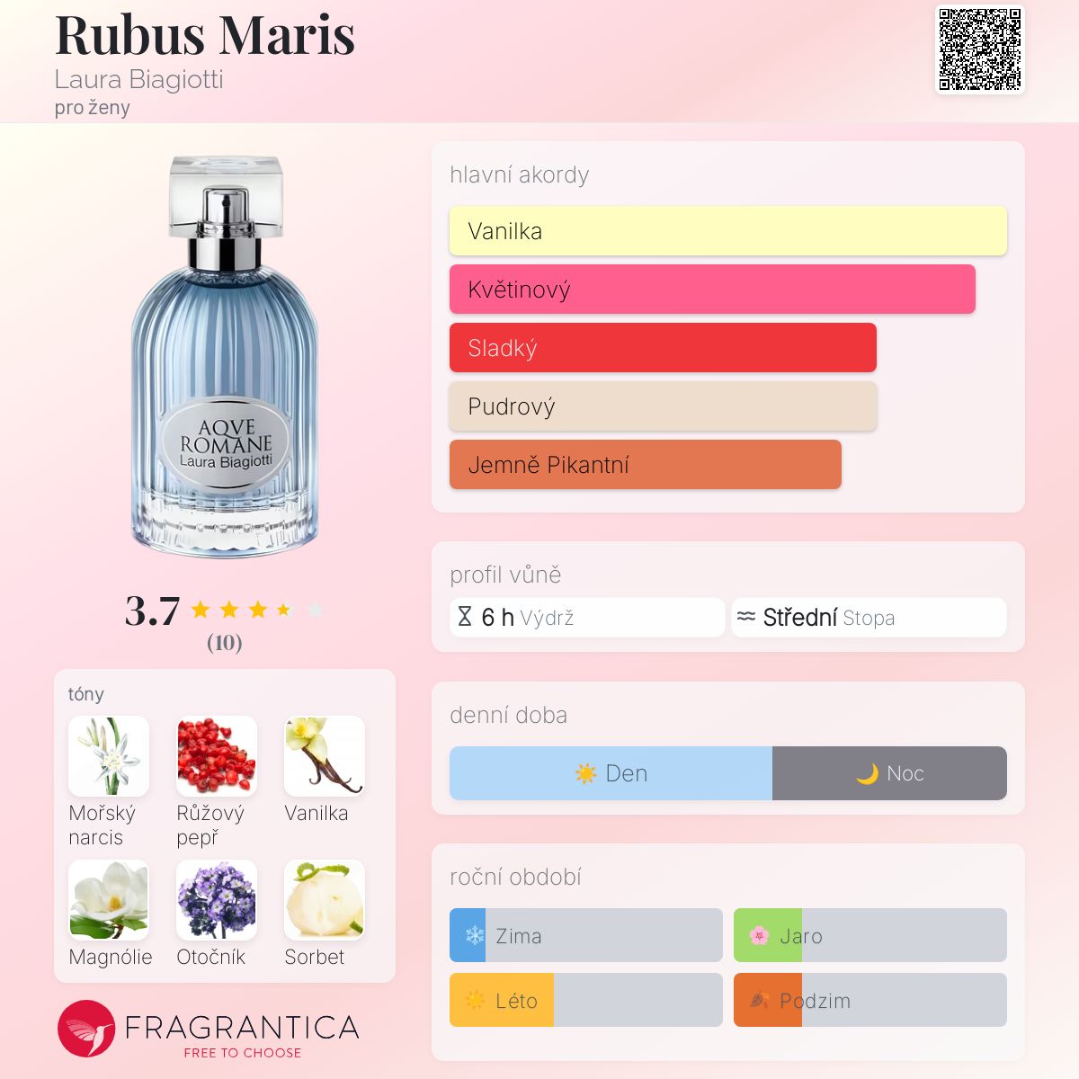 Rubus Maris podle Laura Biagiotti je Floral vůně pro ženy. Toto je nová vůně. Rubus Maris byl/a uveden/a v roce 2025. "Nosem" za touto vůní je Véronique Nyberg. Vrchní tóny jsou Růžový pepř, Sorbet, Heřmánek, Zázvor a Hruška; střední tóny jsouMořský narcis, Magnólie, Růže a Sůl ; základní tóny jsou Vanilka, Otočník a Kašmírové dřevo.