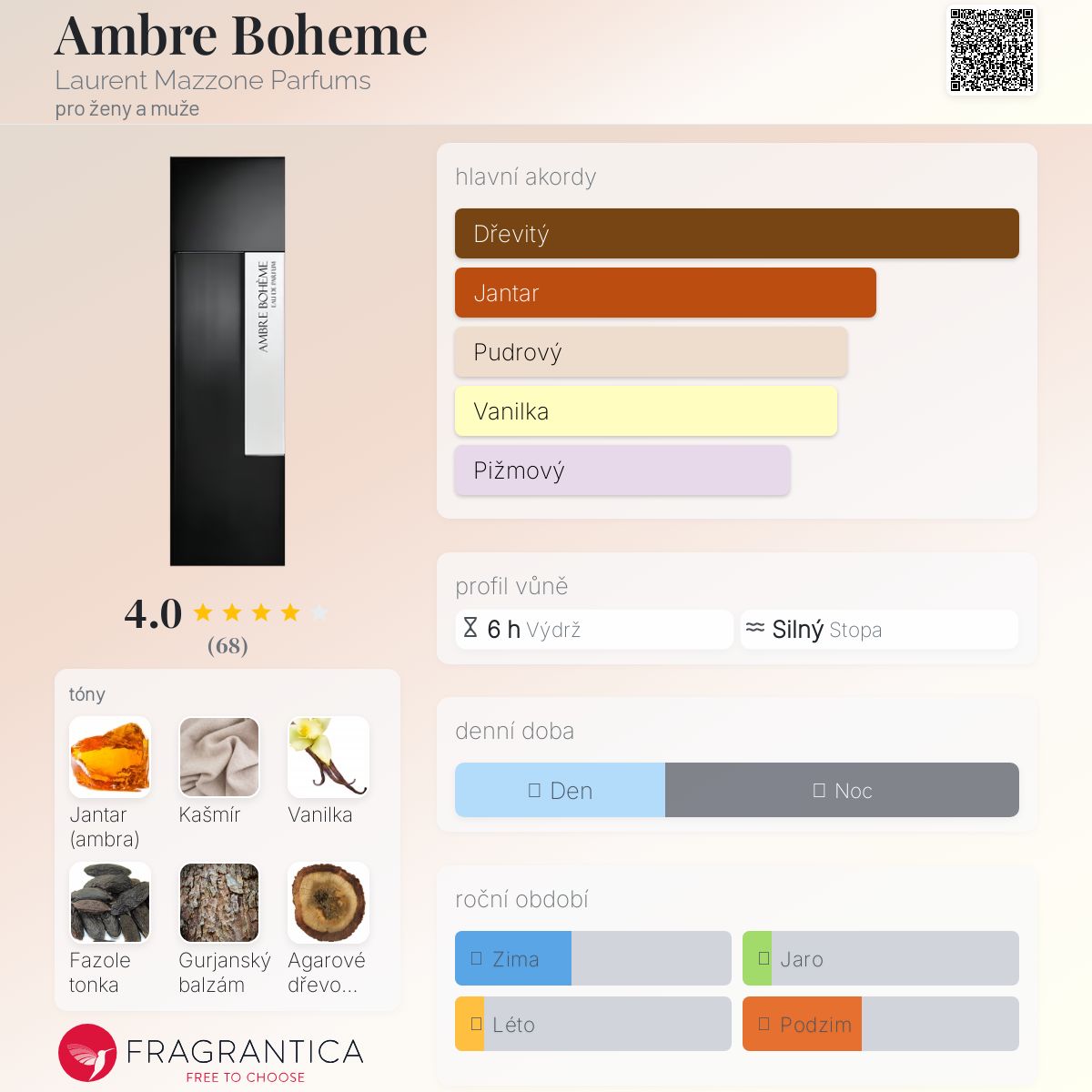 Ambre Boheme podle Laurent Mazzone Parfums je Orientální Woody vůně pro ženy a muže. Ambre Boheme byl/a uveden/a v roce 2019. "Nosem" za touto vůní je Nathalie Feisthauer. Vrchní tón je Muškátový oříšek ; střední tón jeCypriolový olej ; základní tóny jsou Jantar (ambra), Kašmír, Vanilka, Fazole tonka, Gurjanský balzám, Agarové dřevo (oud), Guajakové dřevo, Santalové dřevo, Pačuli, Pižmo a Virginský cedr.