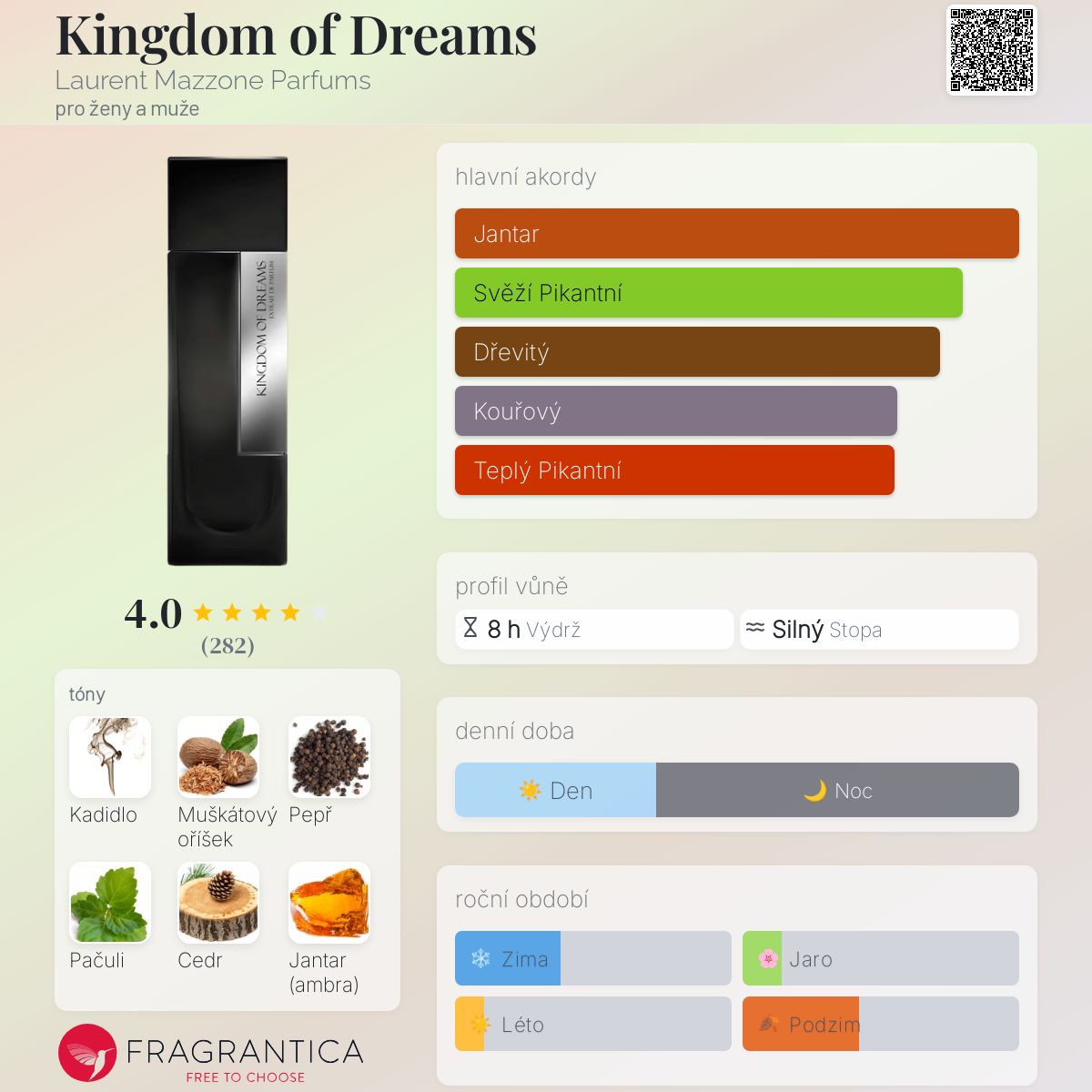 Kingdom of Dreams podle Laurent Mazzone Parfums je Woody Aromatic vůně pro ženy a muže. Kingdom of Dreams byl/a uveden/a v roce 2016. Vrchní tóny jsou Kadidlo, Muškátový oříšek a Černý pepř; střední tóny jsouPačuli, Marocký cedr a Haitský vetiver ; základní tóny jsou Jantar (ambra) a Pižmo.