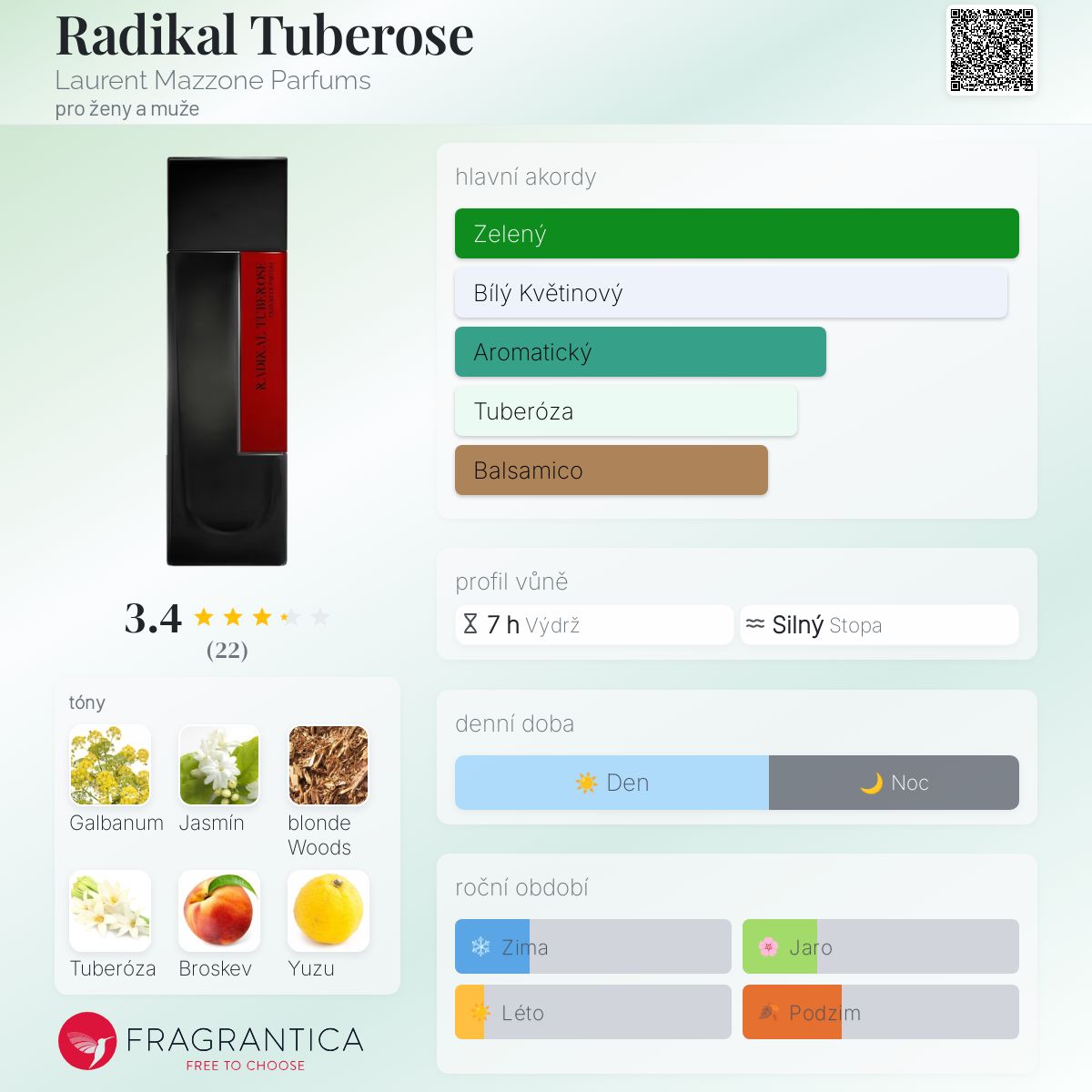 Radikal Tuberose podle Laurent Mazzone Parfums je vůně pro ženy a muže. Radikal Tuberose byl/a uveden/a v roce 2020. Vrchní tóny jsou Galbanum a Yuzu; střední tóny jsouIndický jasmín a Indická tuberóza ; základní tóny jsou Světlá dřeva, Broskev a Sorbet.